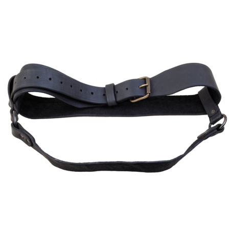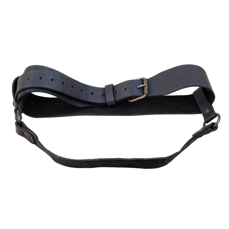 Pas wykonany jest z grubej skóry bydlęcej typu upper leather i wytrzymuje duże obciążenia dzięki zwijanej klamrze.