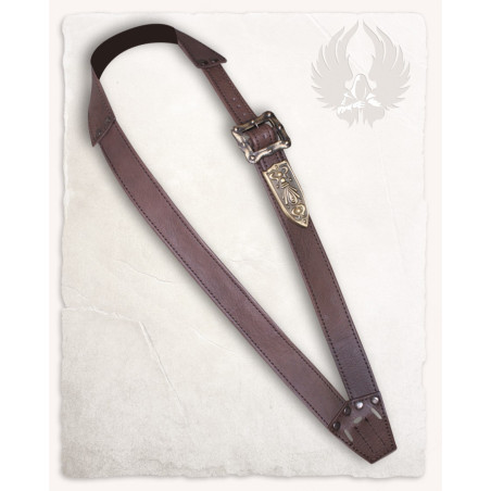 Ten pas naramienny wykonany jest z naturalnej skóry licowej i wyposażony w szczegółowo rzeźbioną mosiężną klamrę.