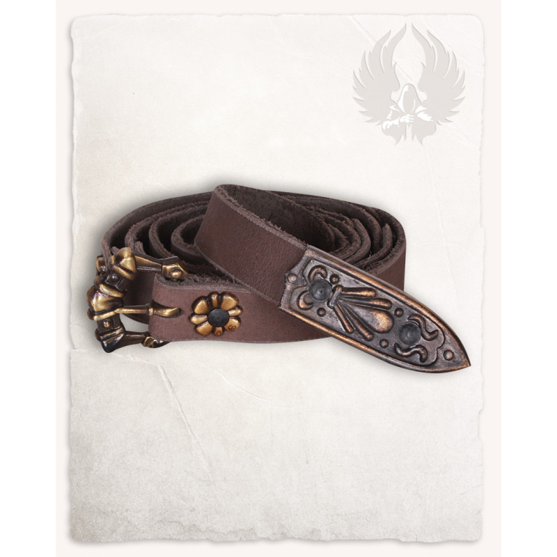 Ten wspaniały pas ozdobiony jest rzucającymi się w oczy metalowymi okuciami i doskonale pasuje do historycznych kostiumów.