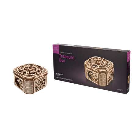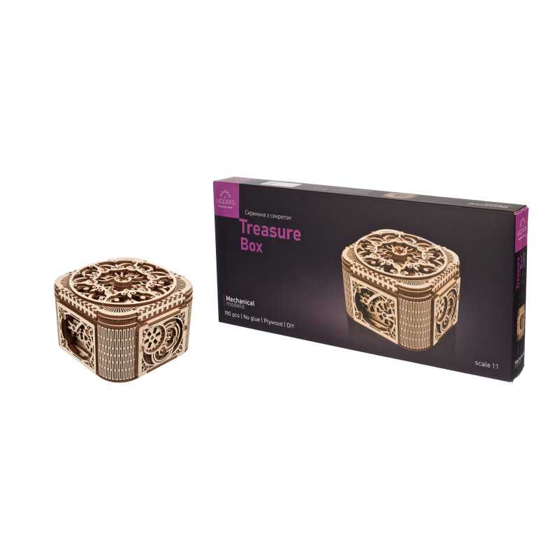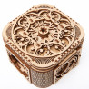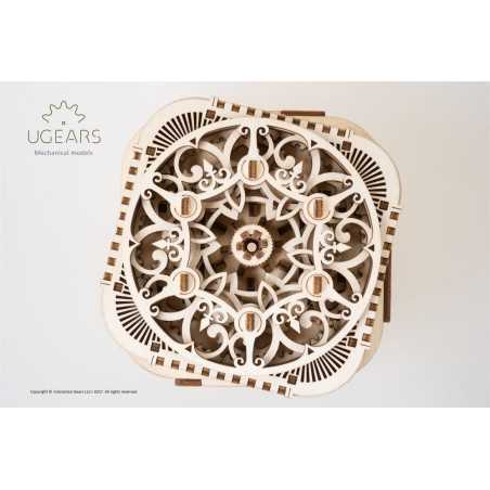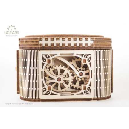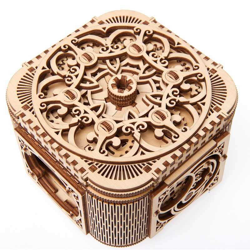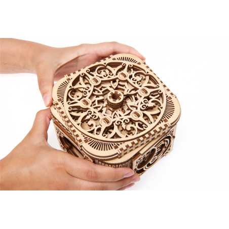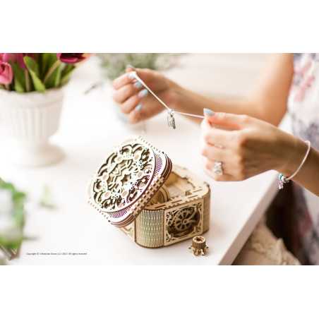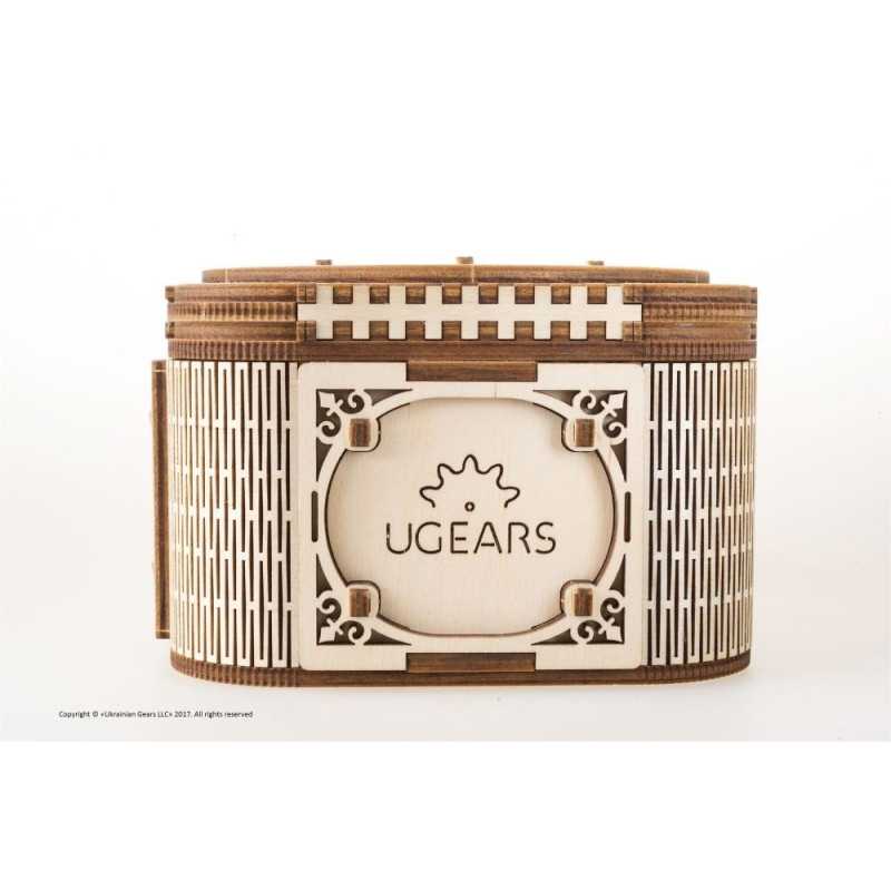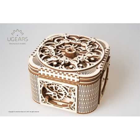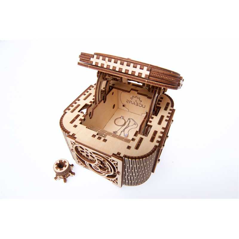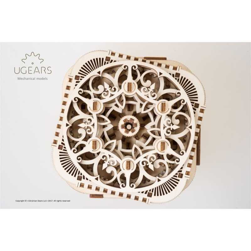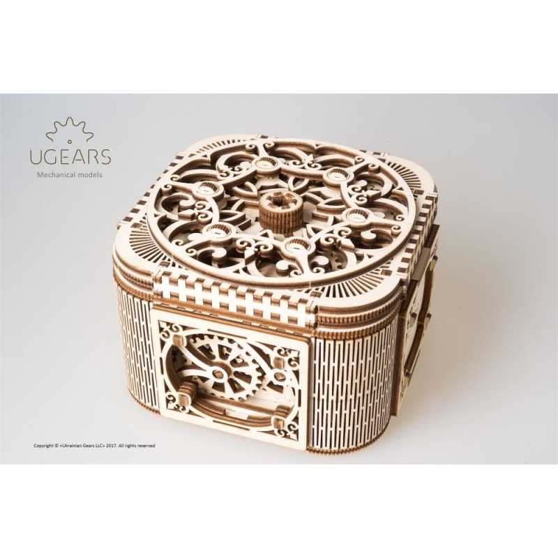 Prawdziwy klejnot w kolekcji drewnianych modeli Ugears, to wyjątkowa mechaniczna skrzynka z sekretem dla przechowywania biżuterii. Tylko ten, kto rozwikła tajemnicę puzzli, może cieszyć się skarbem pięknej mechaniki w swoim wykonaniu. Wiadomo, że aby otworzyć skrzynke, potrzebujemy klucza – a ten klucz się kryje tam, pięknie osadzony w rzeźbionej pokrywce.