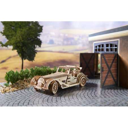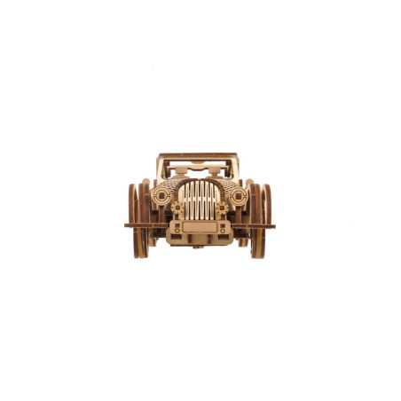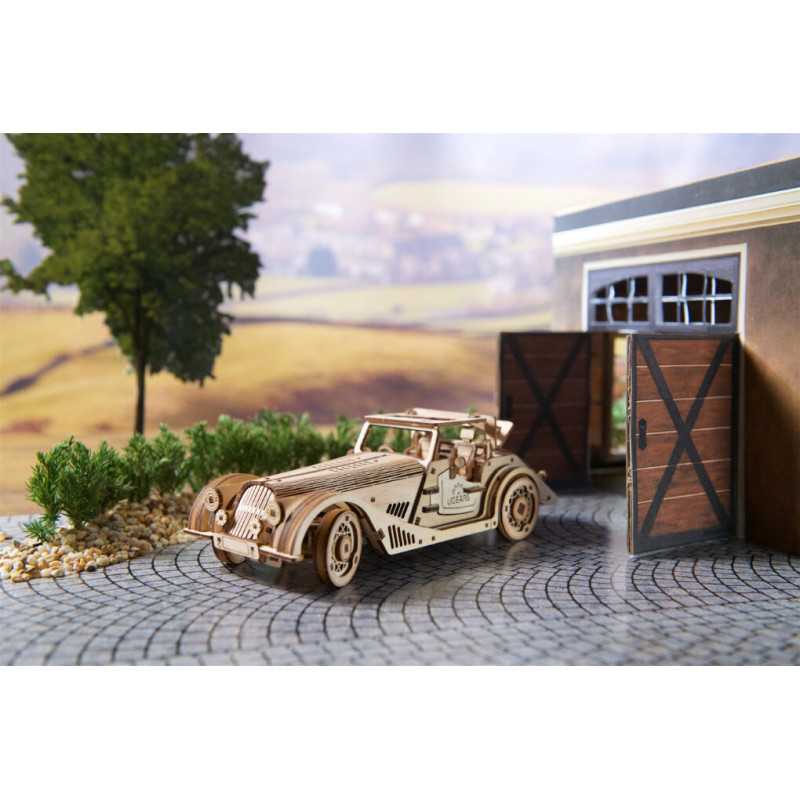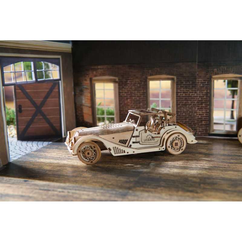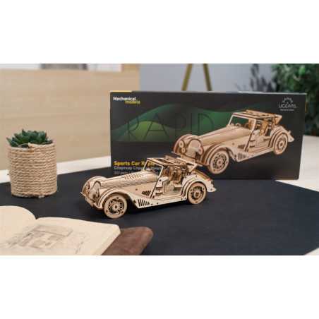 Model mini samochodu Sport Car ma funkcjonalność podwójnego silnika. Nakręć silnik sprężynowy za pomocą sześciu pełnych obrotów klucza zapadkowego znajdującego się na podwoziu modelu lub pociągnij go do tyłu po płaskiej powierzchni, zwolnij i obserwuj, jak samochód przyspiesza, jak każdy samochód zabawkowy z funkcją nakręcania. Ten drewniany model samochodu może skręcać w lewo lub w prawo poprzez regulację przednich kół lub możesz skierować go prosto i przejechać większy dystans. Gumowe opony zwiększają przyczepność i są łatwe do zamontowania i wymiany. Sport Car Rapid Mouse od UGEARS charakteryzuje się realistycznym odwzorowaniem, wybitnymi detalami wnętrza, pragmatycznie zamontowanym kołem zapasowym w bagażniku, które można zamienić z którymś z przednich kół, bocznymi drzwiami, które się otwierają, oraz ręcznym hard-topem z szyberdachem, który składa się w górę i w dół, a także klika :).