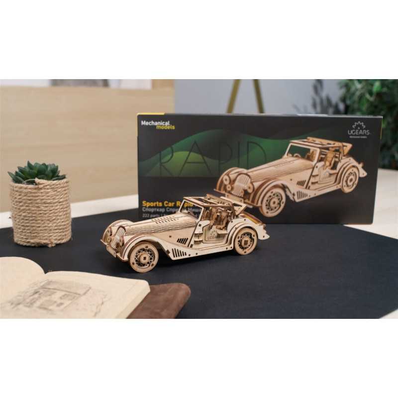 Sportowy samochód Rapid Mouse DIY to mini zestaw samochodowy, który ma 226 części i jest oceniany na poziomie “łatwy”. Wszystko, co potrzebne do montażu, znajduje się w pudełku. Wystarczy wyciąć elementy z laserowo wyciętych desek, a następnie złożyć je razem, postępując zgodnie z naszymi ilustrowanymi instrukcjami krok po kroku w 11 językach (angielski, ukraiński, niemiecki, hiszpański, francuski, włoski, portugalski, polski, japoński, chiński i koreański). Ciesz się 4 godzinami lekko wymagającej pracy, a następnie godzinami zabawy z modelem samochodu DIY. A jeśli spodoba Ci się ten klasyczny mini samochód sportowy, sprawdź inne modele z wyjątkowej linii puzzli 3D UGEARS!