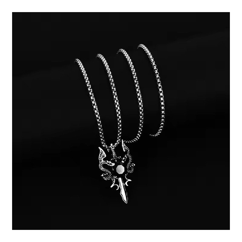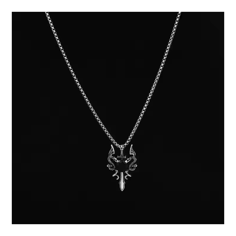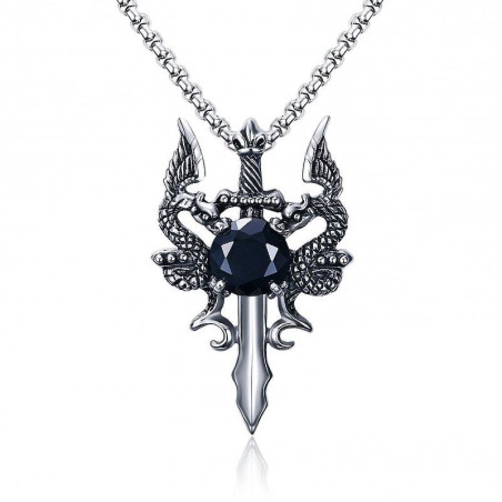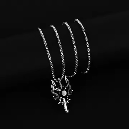 Wyjątkowy naszyjnik o fantazyjnym, niepowtarzalnym wzorze. Wisiorek w kształcie miecza oplecionego smokiem z centralnie osadzonym efektownym kryształem.