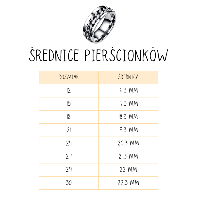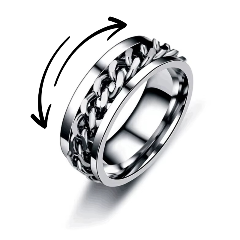 Stylowy i funkcjonalny pierścionek wykonany z trwałego metalu. Posiada ruchomy, obrotowy łańcuch, który działa antystresowo – idealny do dyskretnego zajęcia dłoni i redukcji napięcia. Minimalistyczny design sprawia, że pasuje do każdego stylu, zarówno na co dzień, jak i na specjalne okazje.