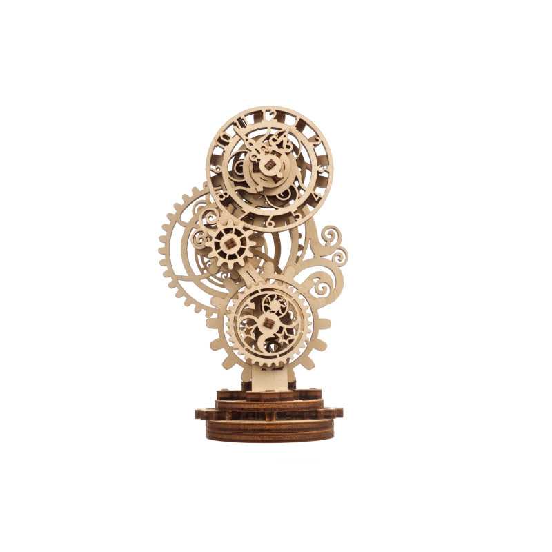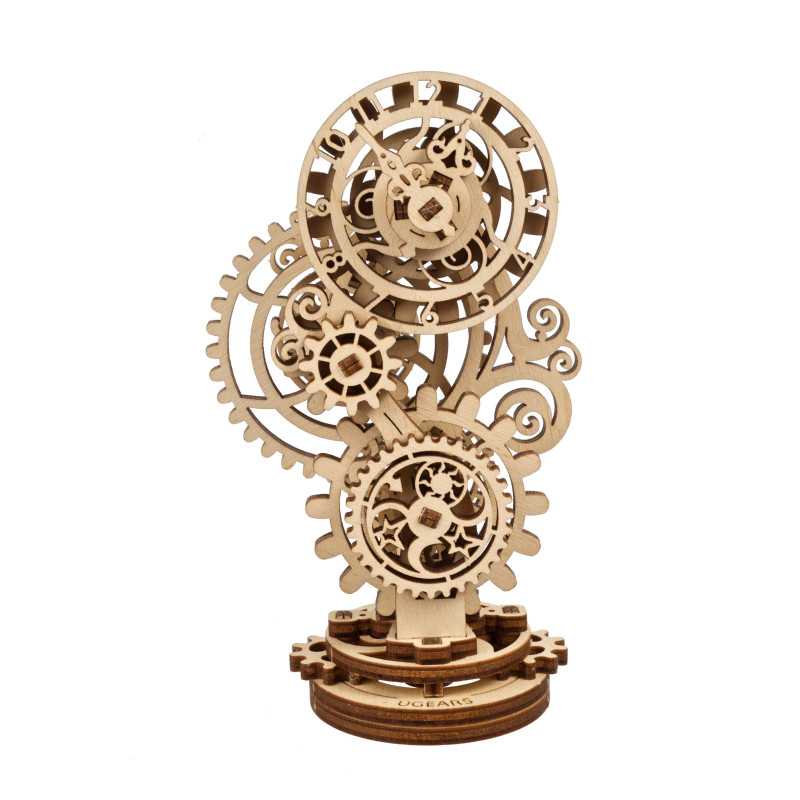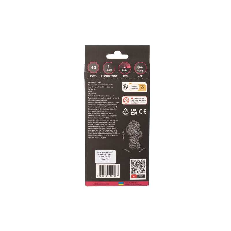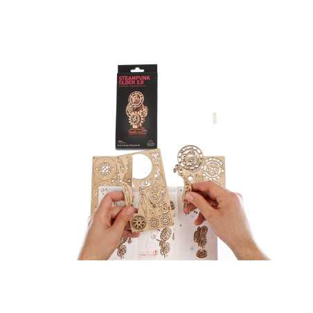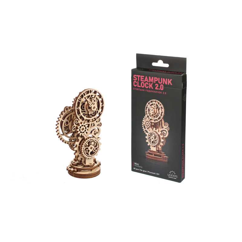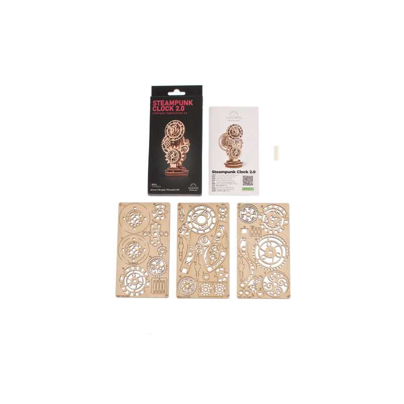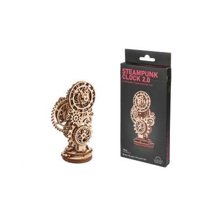 Czasomierz stanowi miniaturową imitację eleganckiego zegara biurkowego z obudową ozdobioną mistrzowską snycerką, wyposażonego w inteligentny mechanizm uruchamiający wskazówki na tarczy. Gotowy zestaw składa się z 43 części, a poziom trudności jego skonstruowania został sklasyfikowany jako „łatwy”. Steampunk Zegar 2.0 będzie wspaniałym prezentem dla każdego początkującego modelarza. Chociaż w obecnych czasach to monitory komputerów i smartfonów pokazują nam godzinę, miło będzie oderwać od nich wzrok, skupiając się na własnoręcznie złożonym zegarze biurkowym, obserwując pracę kół zębatych.