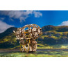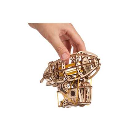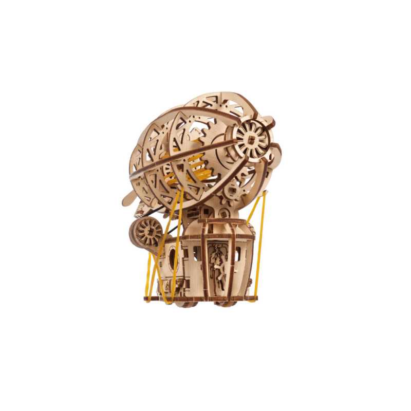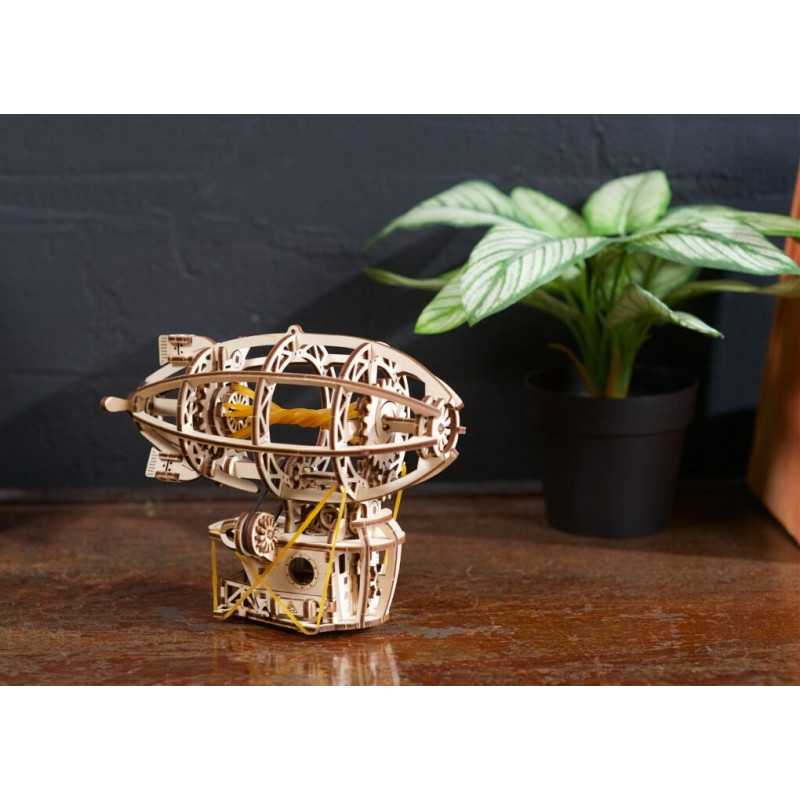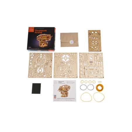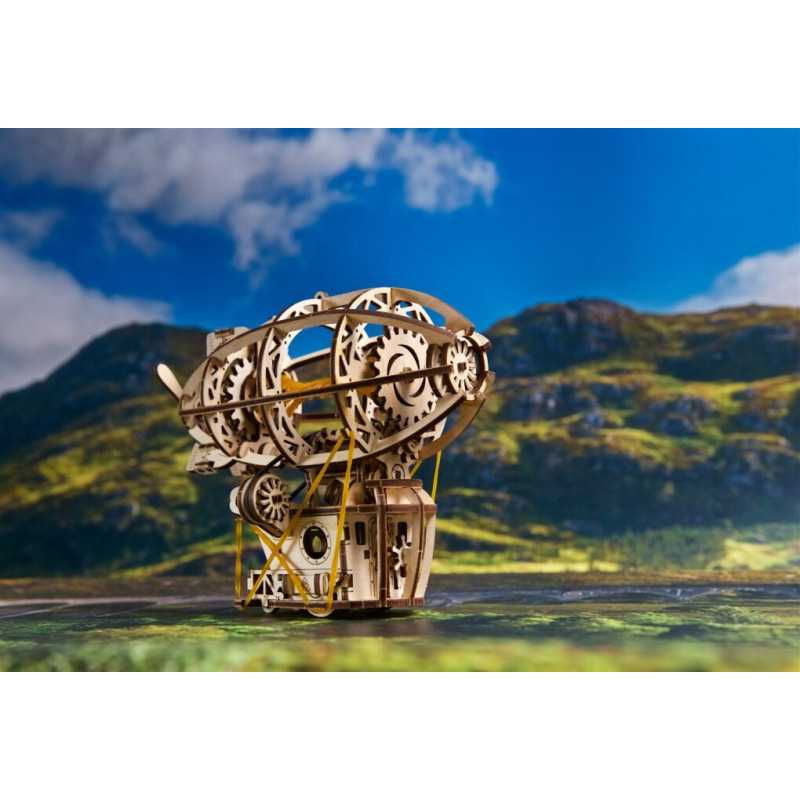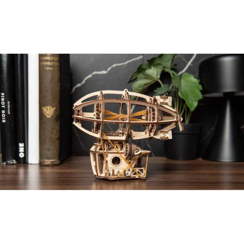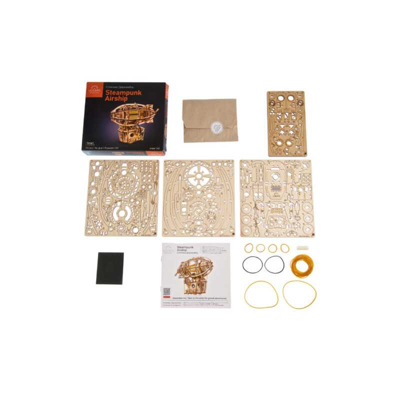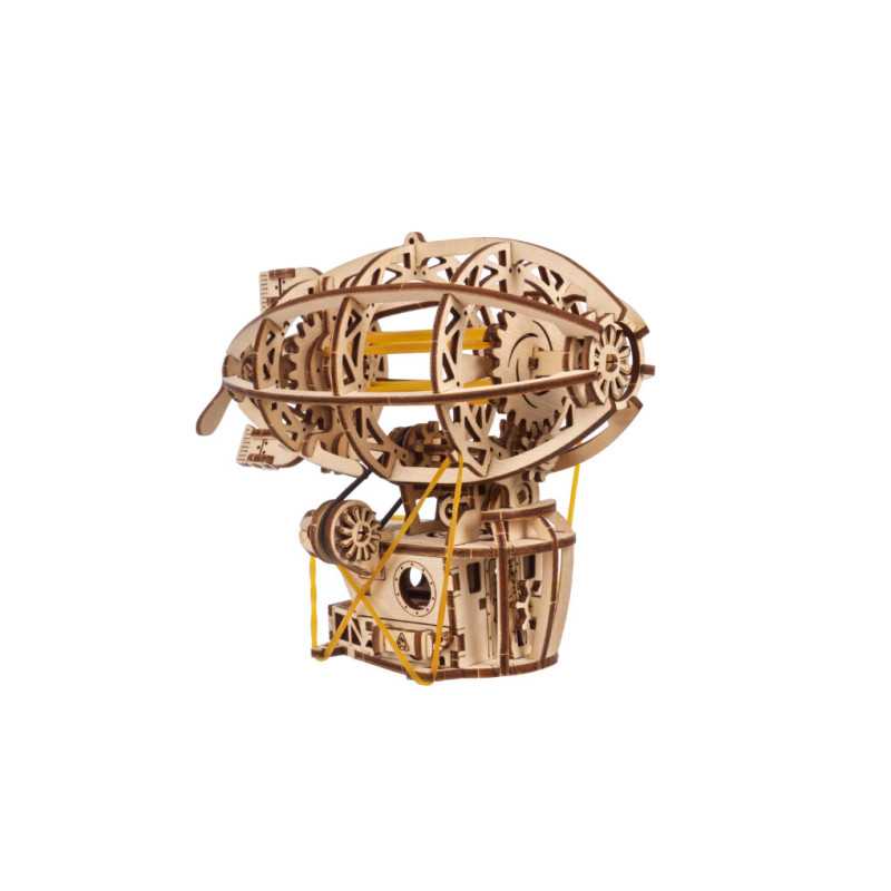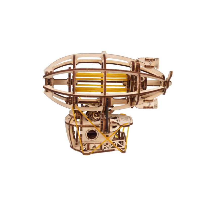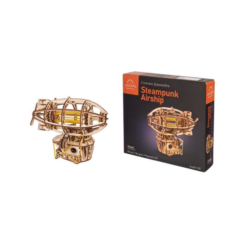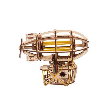 Zbuduj podniebną kabinę, zawieś ją na balonie i wzbij się w przestworza podczas wspaniałych przygód ze Steampunkowym Sterowcem, fantazyjnym drewnianym mini modelem Zeppelina. Ten obiekt do samodzielnego montażu zbudowany został ze steampunkową nutką, z której słynie Ugears. Na model sterowca składają się: kabina w stylu holownika z tylną werandą, nakręcany silnik na gumkę z przełącznikiem Start/Stop, śmigła napędzane silnikiem, obracające się koło statku, ruchome stabilizatory oraz koła, które pozwalają na obroty w przód i w tył do 2 m wzdłuż płaskiej powierzchni, imitując mechaniczny ruch. Nasz kapryśny sterowiec składa się zaledwie ze 170 części, a poziom trudności jego złożenia został uznany jako „łatwy”, dzięki czemu nawet początkujący modelarze nie powinni mieć większych problemów ze skonstruowaniem fantazyjnego samolotu.