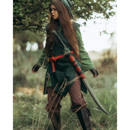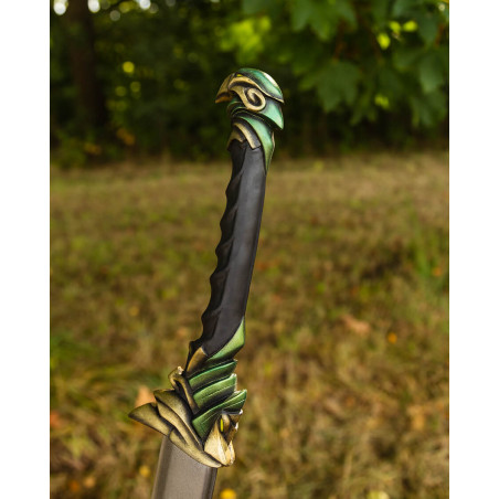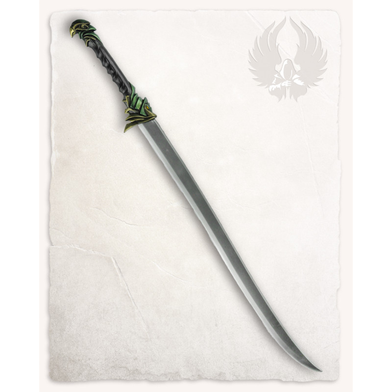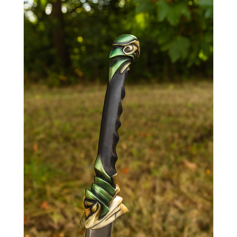 Ten niezwykle piękny miecz to kolejny przykład najwyższej jakości wykonania, będący owocem współpracy między Calimacil i Atelier Fantastic Art. Ta broń inspirowana elfickim stylem to arcydzieło o niezrównanych detalach. Jej jelec w metalicznej zieleni doskonale współgra z głowicą ozdobioną gryfem. Czarna rękojeść idealnie dopasowuje się do dłoni, a smukłe ostrze nadaje jej wyjątkowy wygląd. Jak wszystkie ostrza powstałe z tej ekskluzywnej współpracy, broń ta łączy dbałość o szczegóły z doskonałą funkcjonalnością, stanowiąc idealnie wyważoną i bezpieczną broń do LARP-ów.