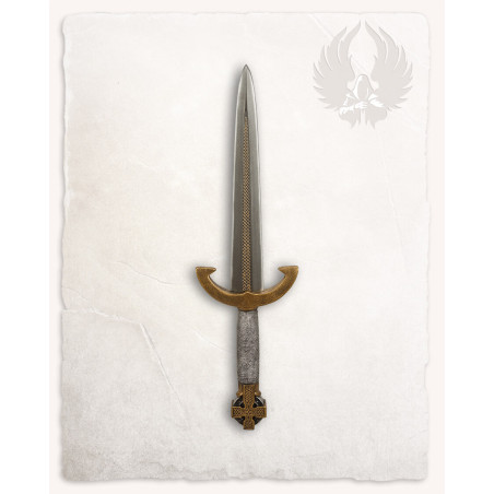 Idealny jako broń boczna dla rycerzy i świętych wojowników, ten sztylet może być również używany przez kupców, samotnych podróżników oraz postacie kapłańskie dzięki swojemu mniej nieporęcznemu rozmiarowi. Ostrze w kolorze stali ozdobione jest efektownymi złotymi detalami biegnącymi wzdłuż jego środka. Rękojeść w kolorze stali i złota posiada uchwyt o fakturze przypominającej linę, co zapewnia doskonałą kontrolę. Dzięki misternym detalom i złotym akcentom może również służyć jako symbol statusu społecznego dla szlachty.