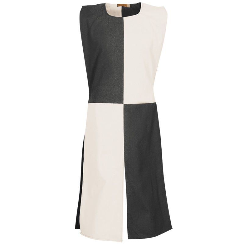 Prosta, prostokątna tabarda bojowa w dwóch kolorach. Wzór jest kwadratowy w heraldycznym stylu.