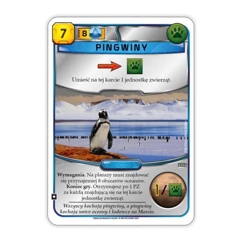 Pingwiny - ta aktywna karta projektów pojawia się w późniejszej fazie gry (wymaga wytworzenia na powierzchni planety przynajmniej ośmiu oceanów). Co każdą aktywację pozwala zasiedlać Marsa pingwinami, dodając jednostki zwierząt wartych 1 punkt zwycięstwa za sztukę.