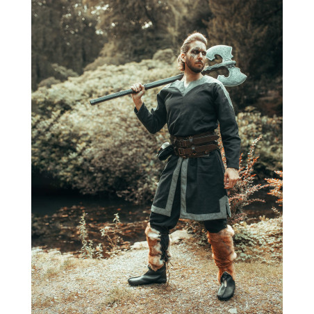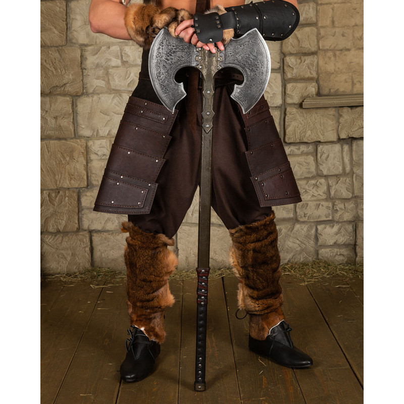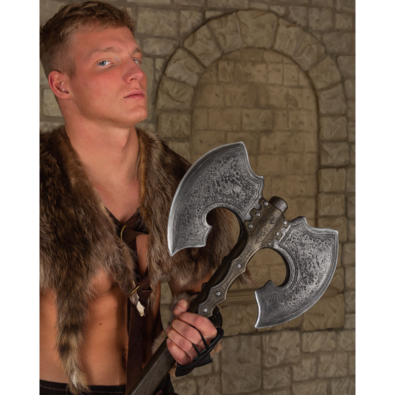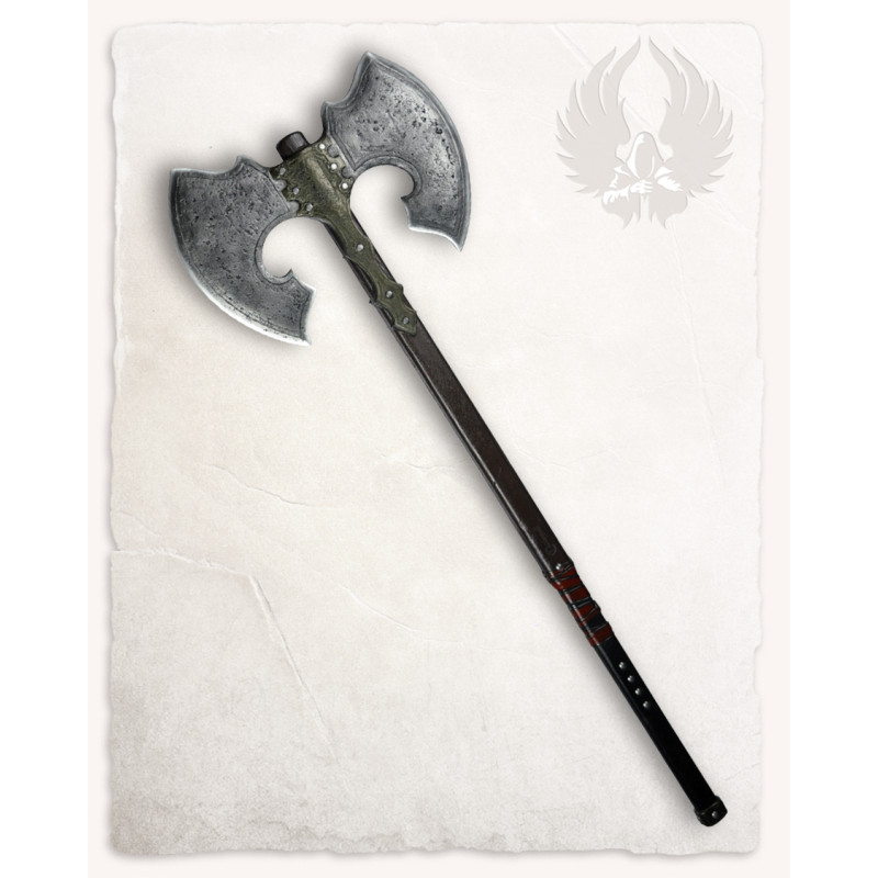 Głowica tego podwójnego topora LARP jest niesamowicie realistyczna dzięki stalowemu kolorowi i postarzałym złotym akcentom. Dodatkowo drewniana rękojeść zakończona jest perfekcyjną imitacją skórzanych detali, co zapewnia doskonałe prowadzenie w każdej sytuacji. Całość wykonana jest z pianki Calimacil, dzięki czemu broń jest całkowicie bezpieczna, a jej trwałość pozwala na wieloletnie użytkowanie.