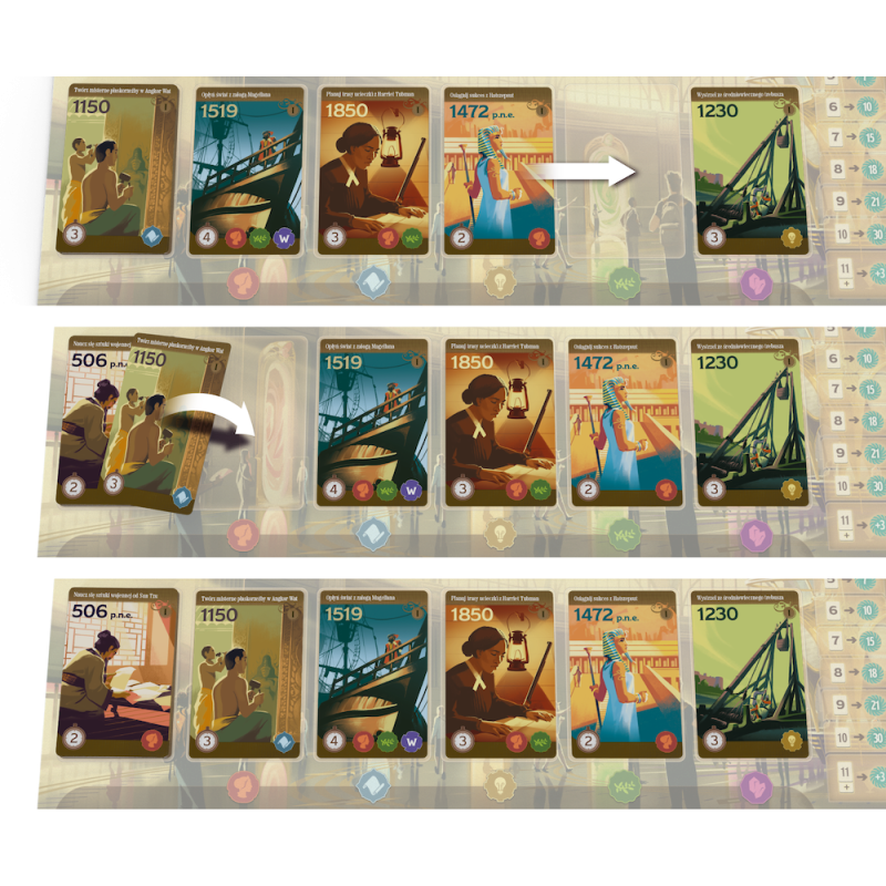 Pozyskane karty historii zapewniają nam żetony doświadczeń, które służą do realizowania indywidualnych celów. Każdy z graczy dysponuje własnym planem podróży, który wymaga innej kombinacji żetonów. Realizowanie tych celów pozwala na zdobywanie cennych punktów. Otrzymujemy je również za odbyte wędrówki, czyli zestawy zebranych kart historii, które tworzą nieprzerwany ciąg chronologicznych wydarzeń. Im więcej kart uda nam się zebrać, tym więcej punktów otrzymamy.