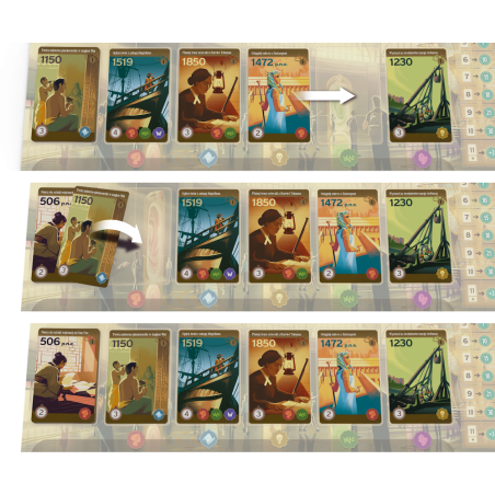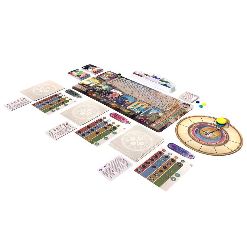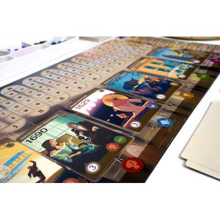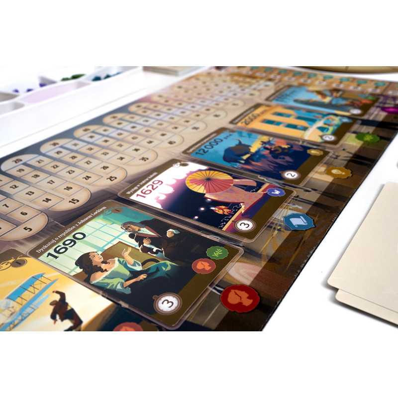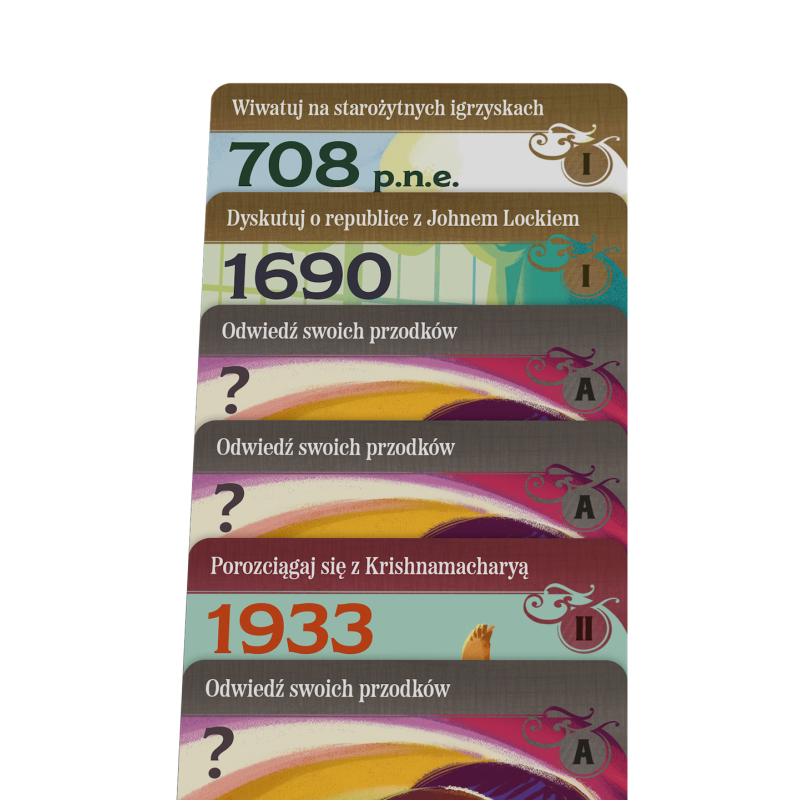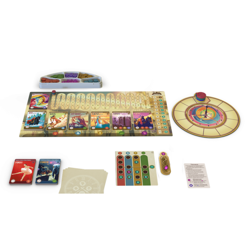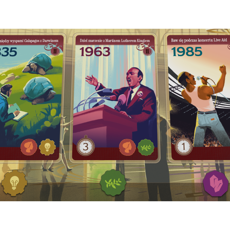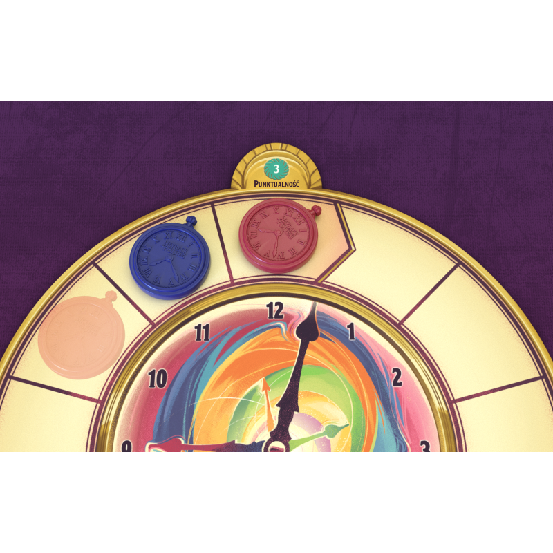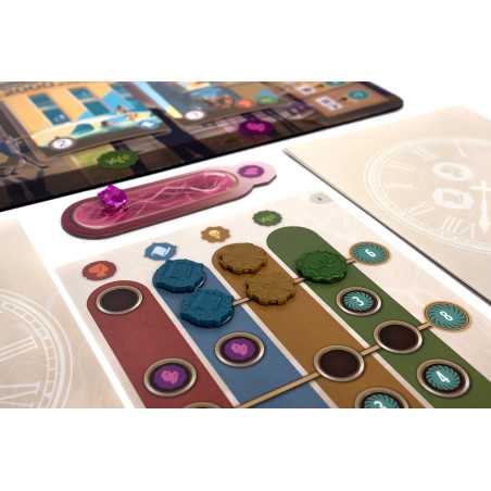 Na planszy czekają na Was karty wydarzeń, do których możecie się przenieść. W grze walutą jest czas zaznaczany na specjalnym zegarze, a koszt karty jest zależny od jej położenia. Jeśli wyjątkowo zależy nam na którejś z nich, możemy przesunąć się dalej na planszy zegara, jednak warto pamiętać, że ma ona ważną funkcję – wyznacza kolejność, w jakiej rozgrywamy swoje tury. W tej grze nie działamy jedno po drugim; aktywnym graczem jest ten, kto jest najbardziej z tyłu na planszy zegara. Pozornie niezwykle opłacalny ruch może się okazać mniej atrakcyjny, gdy weźmiemy pod uwagę, że dzięki nam przeciwnicy będą mogli rozegrać po dwie rundy zanim nas dogonią.