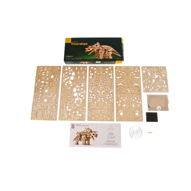 Model UGEARS Triceratops ma poziom “zaawansowany”, składa się z 400 części i obiecuje ponad 8 godzin ekscytującego montażu. Do montażu nie jest wymagany klej ani specjalne narzędzia. Wystarczy postępować zgodnie z instrukcjami krok po kroku w 11 językach (angielskim, niemieckim, ukraińskim, francuskim, polskim, hiszpańskim, portugalskim, japońskim, włoskim, chińskim i koreańskim), aby go zbudować, upewniając się, że wszystkie ruchome części są odpowiednio przeszlifowane i nasmarowane. To zapewni mu optymalne działanie. Ten potężny gigant może pokonać do 90-100 cm po każdym nakręceniu.