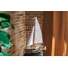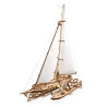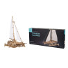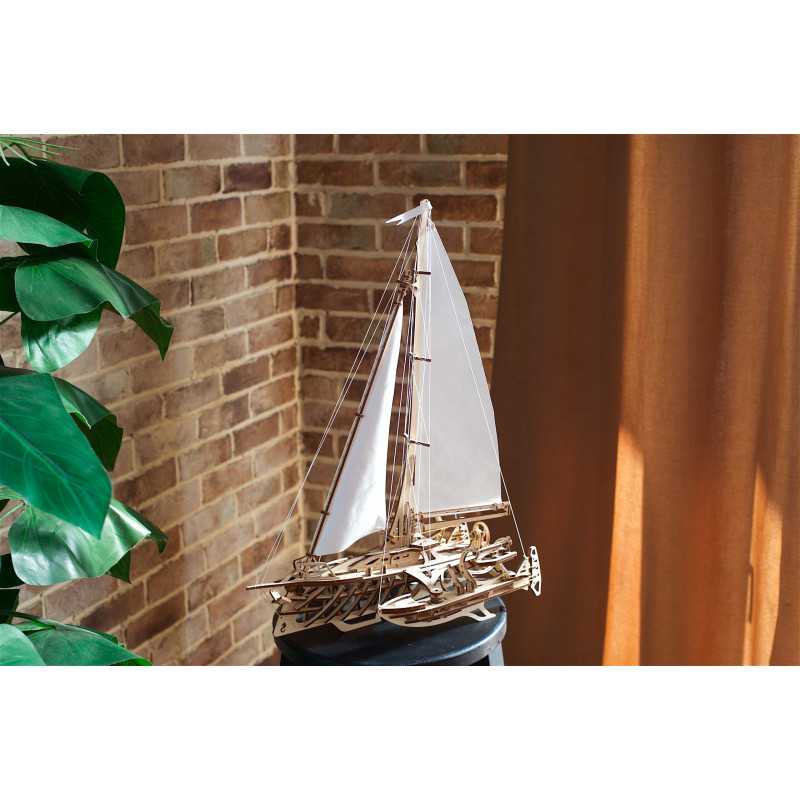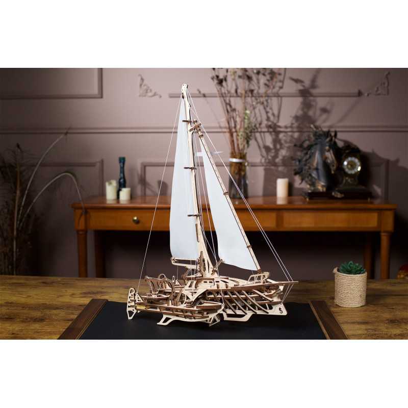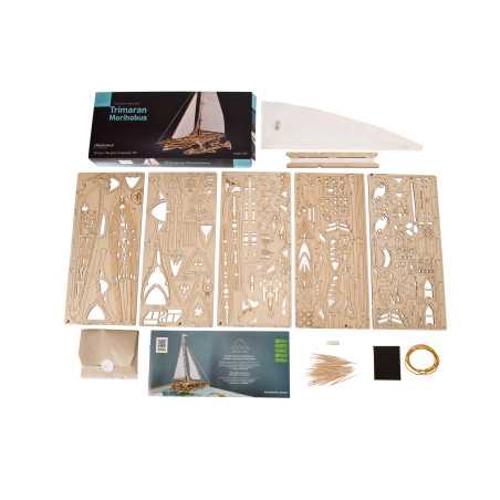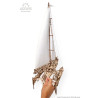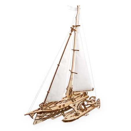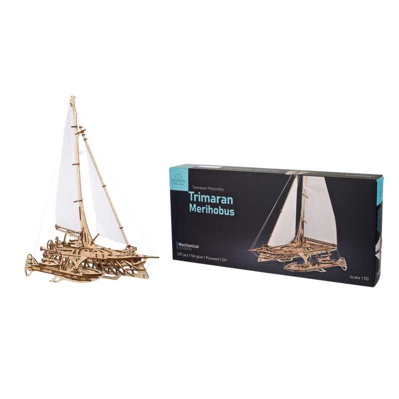 Redukcyjny model “Trimaran” jest wykonany jako tradycyjny jacht żaglowy. Design “Merihobusu” przewiduje olbrzymią ilość maksymalnie realistycznych części, elementów i sprzętu znanego wszystkim żeglarzom. Znajdziesz tutaj miniaturowe windy, takielunek, żagle, pokładniki i wręgi – jak na prawdziwym statku. Mechaniczny model “Trimaran Merihobus” jest wykonany z wysokiej jakości sklejki, która została zbadana przez europejskie laboratoria i jest stosowana m.in. w produkcji mebli dziecięcych. Zestaw zawiera wszystkie elementy niezbędne do składania. Jakość wykonania elementów jest bardzo wysoka, ponieważ wycinane są one ze sklejki metodą laserową.