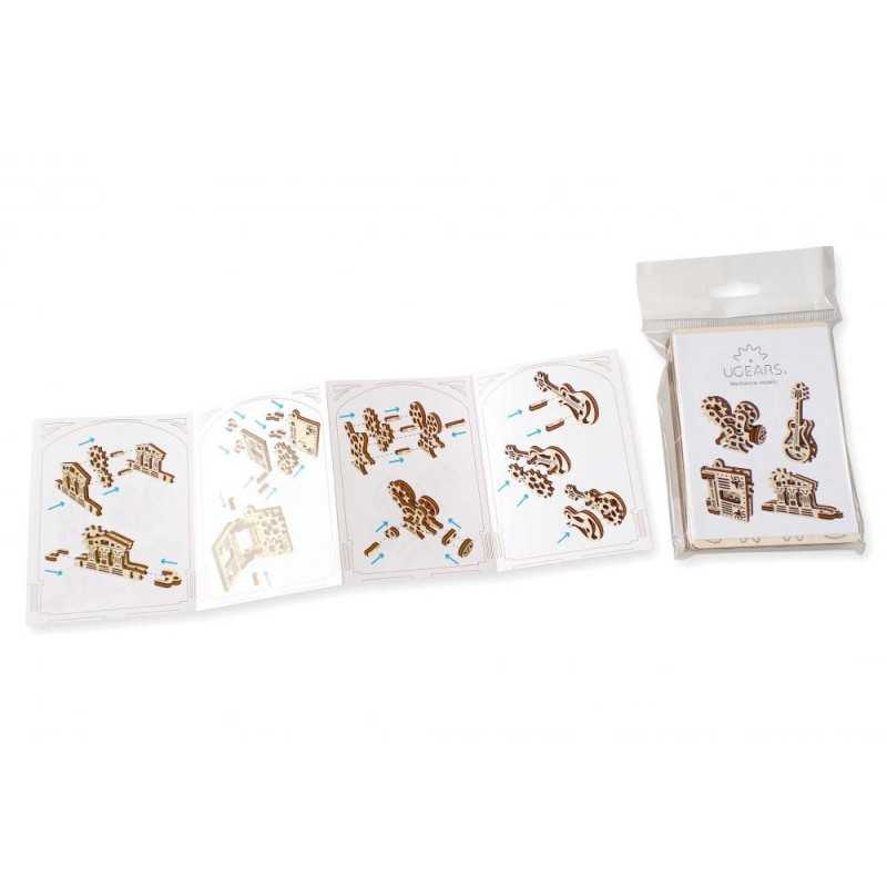 Unikalny zestaw 4 oddzielnych miniaturowych modeli do samodzielnego składania dla dorosłych i dzieci w wieku od 5 do 80 lat i więcej. Składanie modeli zajmuje niewiele czasu, a miniaturowy rozmiar pozwala zabrać je ze sobą wszędzie. Gotowy model to mechaniczna zabawka z ruchomymi elementami.