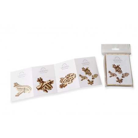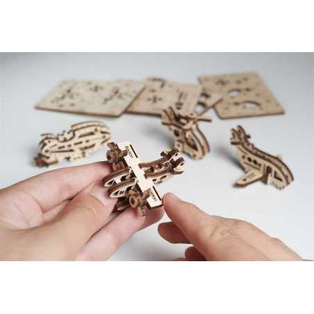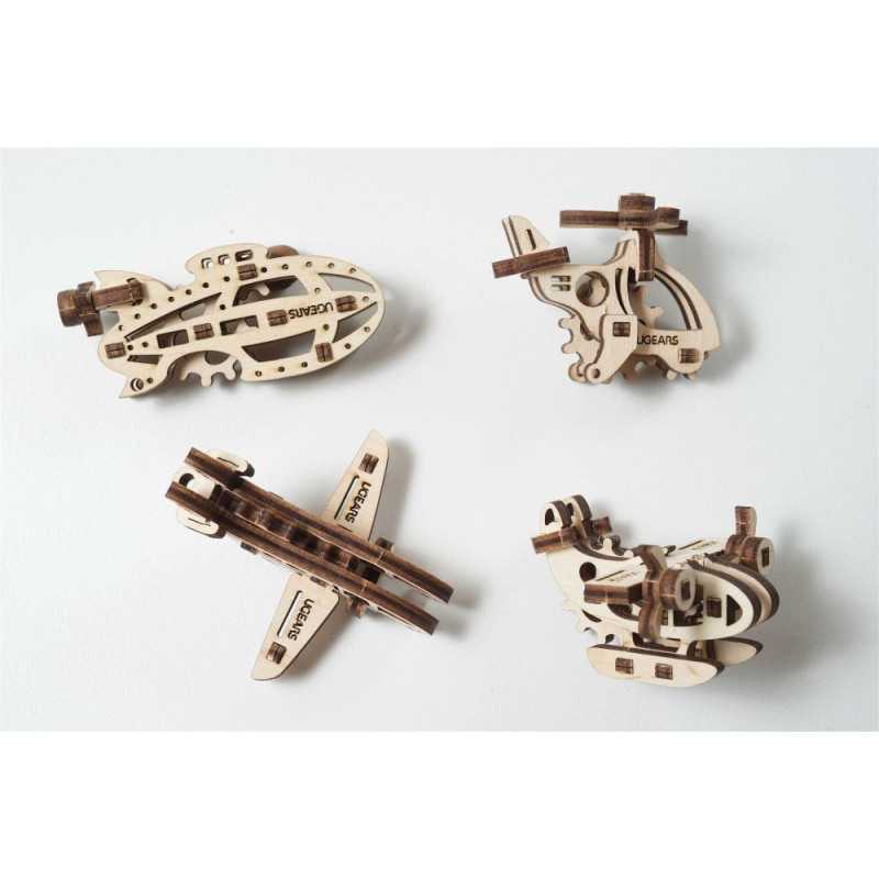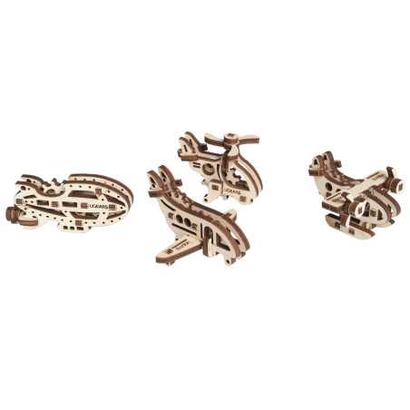 Modele są wykonane ze sklejki o wysokiej jakości, sprawdzonej przez europejskie laboratoria. W środku opakowania znajdziesz 4 deski ze sklejki, z których wystarczy wycisnąć już gotowe detale i złożyć 4 różne modele. Każdy z modeli można łatwo złożyć jako puzzle bez użycia kleju według ilustrowanej instrukcji krok po kroku.