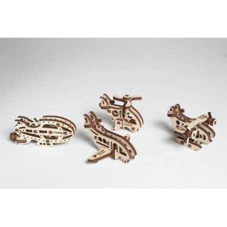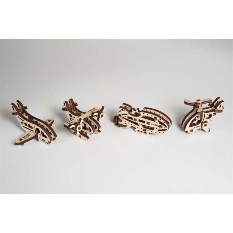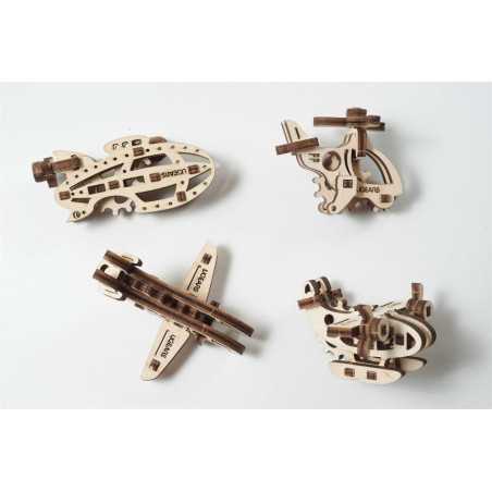 Unikalny zestaw 4 oddzielnych miniaturowych modeli do samodzielnego składania dla dorosłych i dzieci w wieku od 5 do 80 lat i więcej. Składanie modeli zajmuje niewiele czasu, a miniaturowy rozmiar pozwala zabrać je ze sobą wszędzie. Gotowy model to mechaniczna zabawka z ruchomymi elementami.