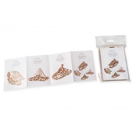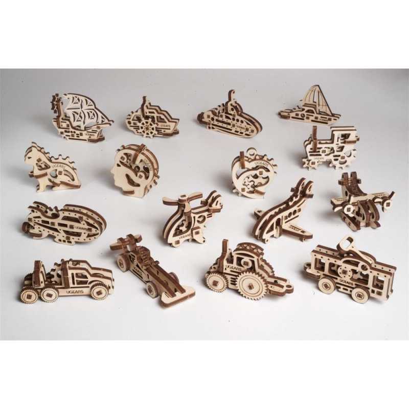 Unikalny zestaw 4 oddzielnych miniaturowych modeli do samodzielnego składania dla dorosłych i dzieci w wieku od 5 do 80 lat i więcej. Składanie modeli zajmuje niewiele czasu, a miniaturowy rozmiar pozwala zabrać je ze sobą wszędzie. Gotowy model to mechaniczna zabawka z ruchomymi elementami.
