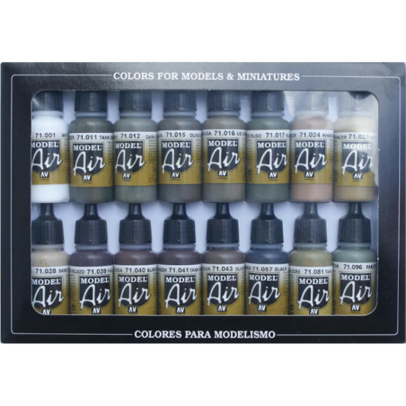 Model Air to seria matowych farb akrylowych na bazie wody, opracowanych specjalnie do nakładania przy pomocy aerografu. Gama Model Air zawiera najbardziej kompletny wybór kolorów wojskowych. Każdy odcień jest oparty na szeroko zakrojonych badaniach ekspertów nad istniejącymi i historycznymi odniesieniami wojskowymi, by zaoferować najwyższą możliwą dokładność historyczną.   Farb Model Air można używać bezpośrednio lub po rozcieńczeniu przy pomocy Airbrush Thinner lub Flow Improver. Zaleca się nakładanie produktu na wcześniej spodkładowaną powierzchnię, w kilku cienkich warstwach. Preparaty schną bardzo szybko, tworząc jednolitą warstwę o niezwykłej odporności, z zachowaniem najdrobniejszych nawet detali.   Farby Model Air zamknięte są w wygodnych butelkach o pojemności 17 ml, wyposażonych w wygodny zakraplacz zapobiegający parowaniu i wysychaniu preparatu, dzięki czemu zachowa on swoje właściwości na długi czas!