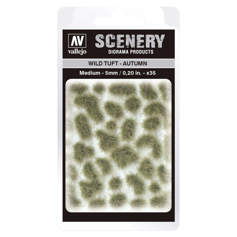 Vallejo Scenery to gama miniaturowych kępek imitujących roślinność, które pomagają uzupełnić scenki, dodając realizmu modelom, figurkom, terenom do gier wojennych czy dioramom.   Vallejo Scenery zawiera szeroką gamę rozmiarów i wzorów. Tufty są gotowe do użycia, należy po prostu odkleić każdą kępkę osobno i umieścić ją w scenie - są amoprzylepne do podłoża, choć można je również przymocować klejem PVA, aby uzyskać mocniejsze i trwalsze przyleganie.