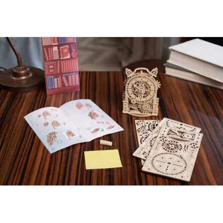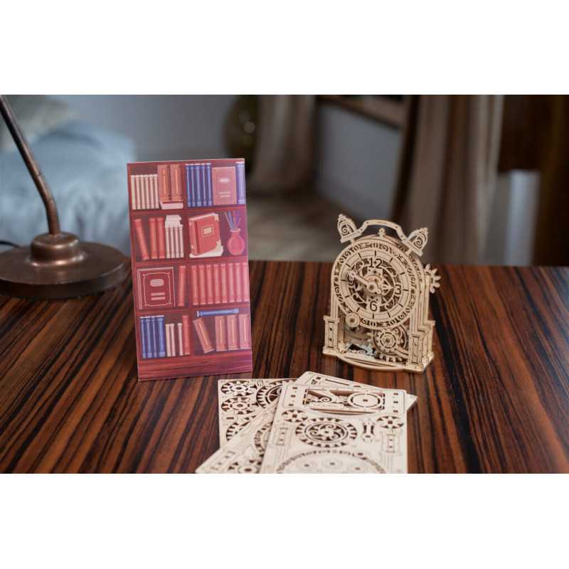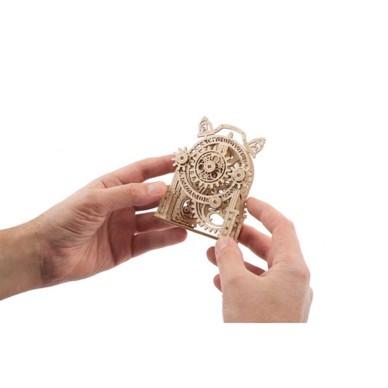 Kiedy poruszysz dużym kołem zębatym z boku, strzałkowe wskazówki Budzika obracają się i dzwonki dzwonią. To nadaje drewnianemu modelowi zegara charakterystyczny “klekot” alarmu. Podczas gdy ten dekoracyjny drewniany model zegara nie odmierza czasu, wskazówki zegara są tak ustawione, że jeden pełny obrót wskazówki minutowej przesuwa wskazówkę godzinową o jedną pozycję. Design tarczy zegara zawiera różne elementy, w tym słońce, rośliny, zawijasy zegara słoneczny, i jest osadzony na szczycie kolumn, które nadają całemu modelowi atrakcyjną strukturę architektoniczną.
