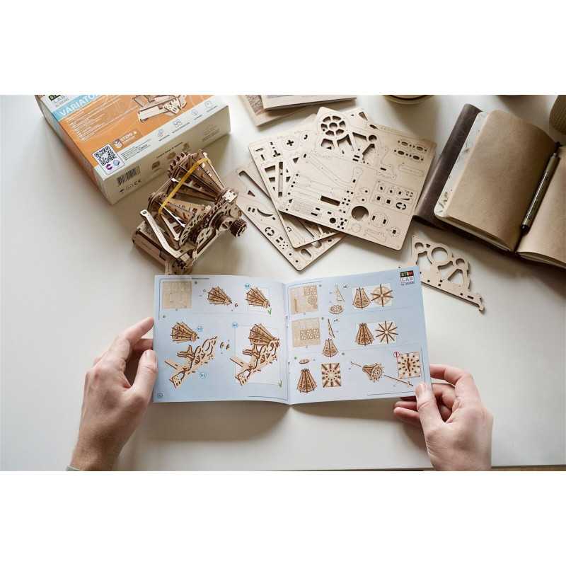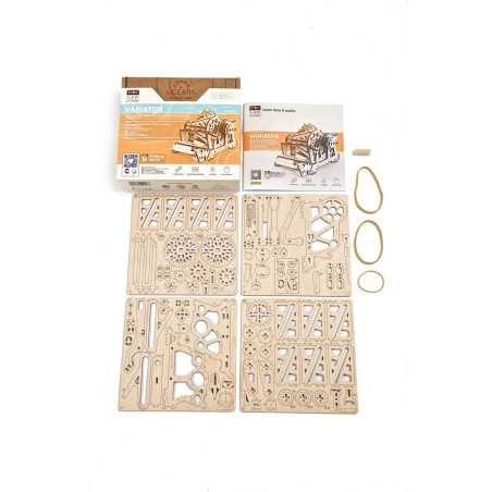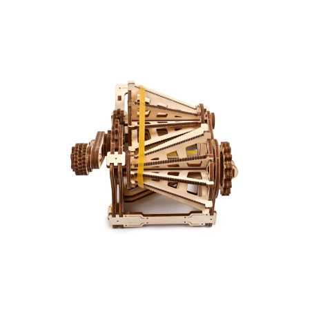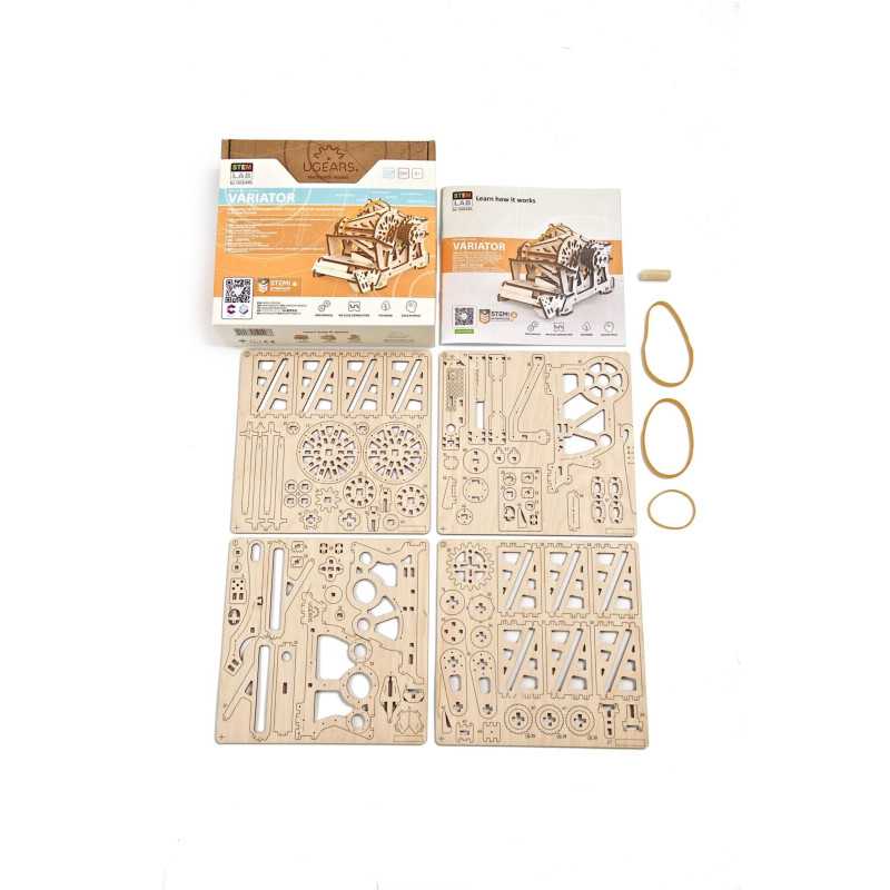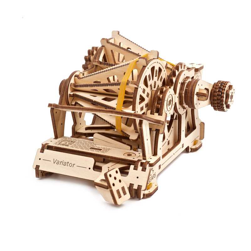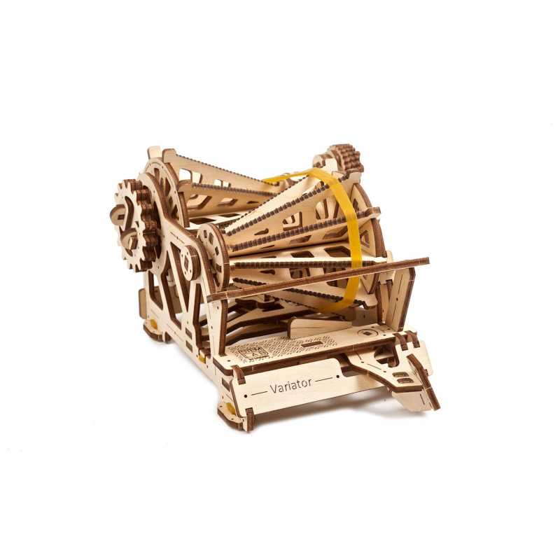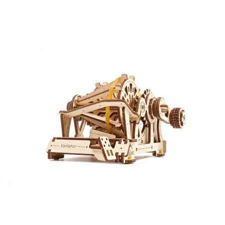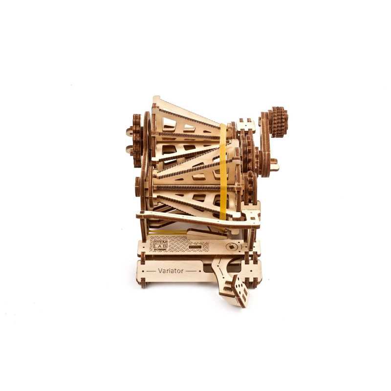 Mechaniczny wariator z kolekcji laboratoryjnej Ugears STEM jest w pełni funkcjonalną, drewnianą repliką przekładni stożkowej CVT o napędzie pasowym. Stożkowa przekładnia CVT zmienia przełożenie napędu poprzez przesuwanie koła lub paska w górę i w dół osi stożkowego walca. W modelu Ugears Wariator pas, napędzany ręcznie przez reduktor, przenosi obroty na napędzane koła pasowe stożka. Za pomocą widełek przekładni zmieniamy biegi i obserwujemy, jak prędkość obrotowa koła stożkowego napędzanego spada lub rośnie, podczas gdy prędkość obrotowa koła stożkowego napędzającego pozostaje taka sama. Ze względu na otwartą konstrukcję modelu, będziesz mógł zobaczyć cały proces.
