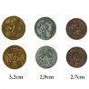 Te cynkowe monety pokryte zostały grubą warstwą odpowiednio niklu (srebrne), mosiądzu (złote) i miedzi (miedziaki). Powłoki są oksydowane, dzięki czemu wyglądają jakby używane były przez lata.