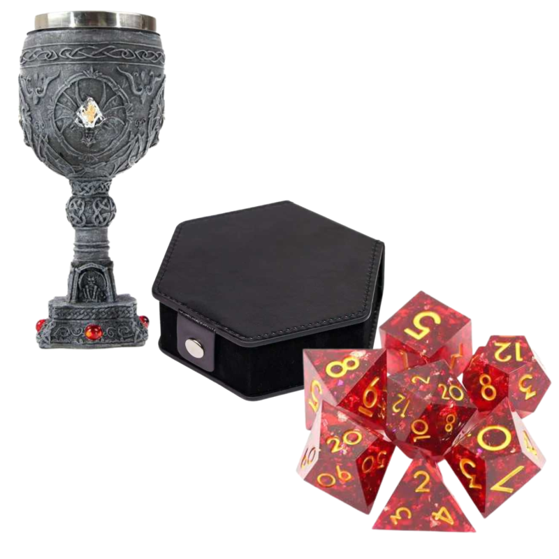 Zestaw prezentowy dla fana gier fabularnych RPG. Zawiera wszystkie akcesoria przydatne do rozpoczęcia przygody z RPG. Jest również świetnym sposobem na powiększenie swojej kolekcji gadżetów do sesji.