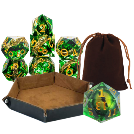 • Zestaw 7 kości wykonanych z żywicy epoksydowej. Idealnie nadają się do każdego systemu i dla każdego gracza.