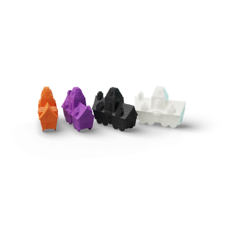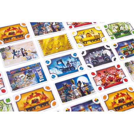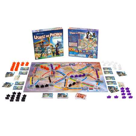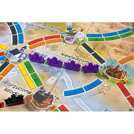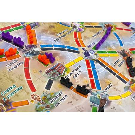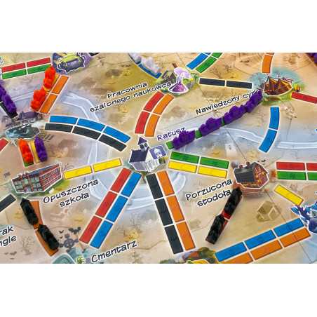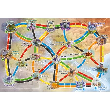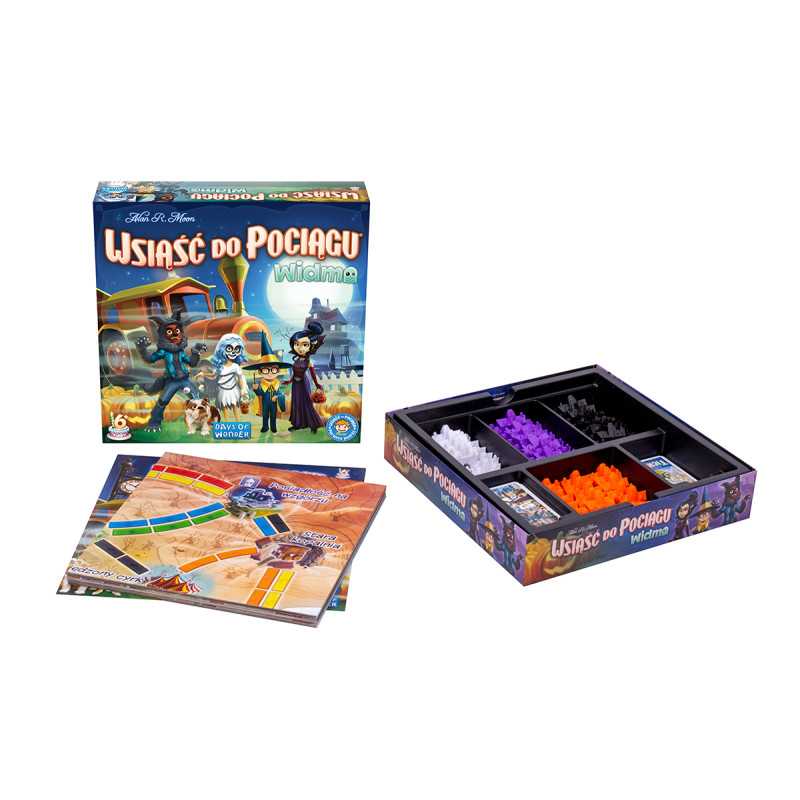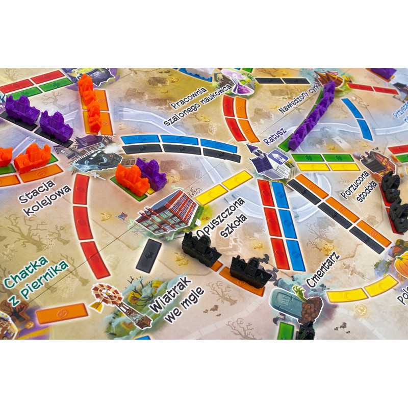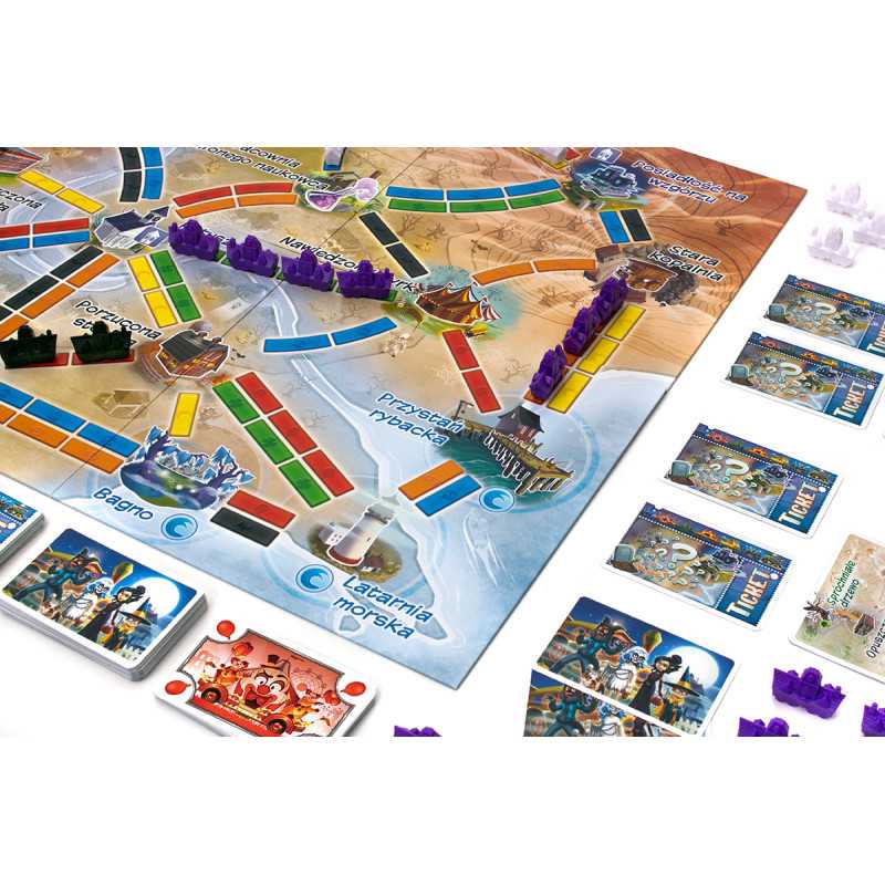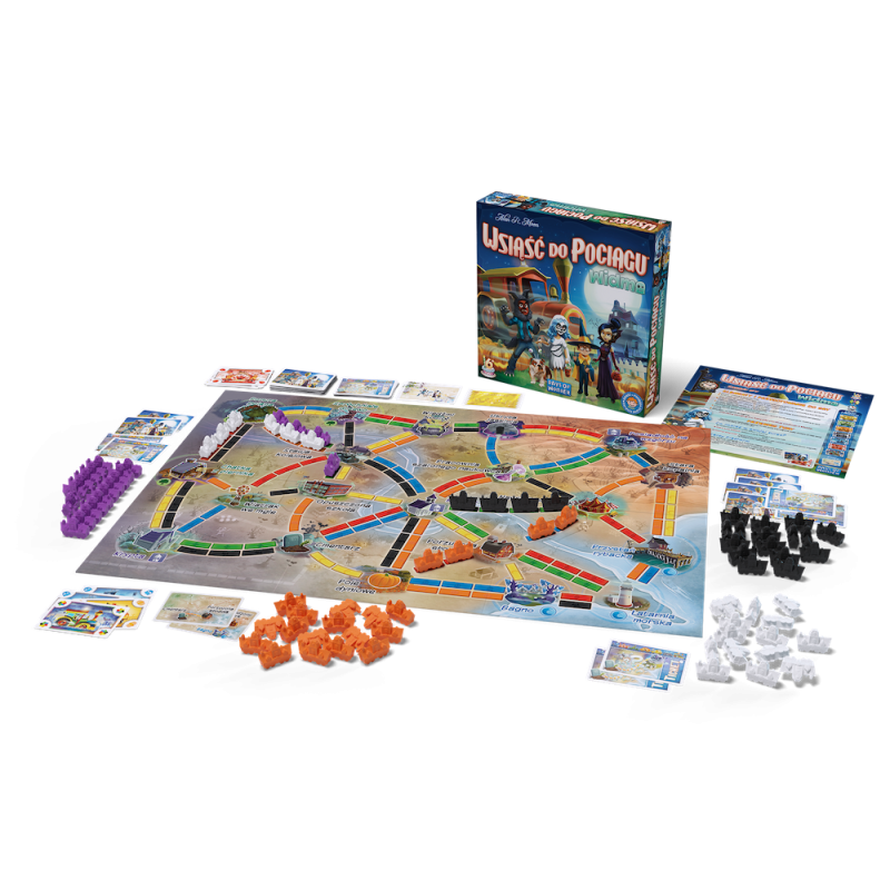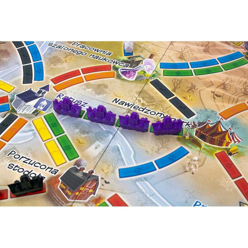 Wsiąść do Pociągu Widmo to łatwa do nauczenia i szybka odsłona popularnej serii gier rodzinnych, doskonała, żeby wprowadzić do niej młodszych graczy. Podczas zabawy dzieci i rodzice będą zbierali specjalne, kolorowe karty platform, które pozwolą im zajmować kolejne odcinki na mapie Koszmarkowa.