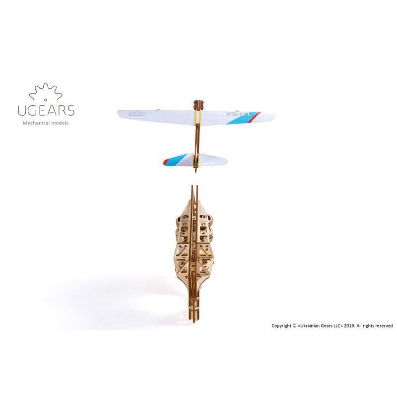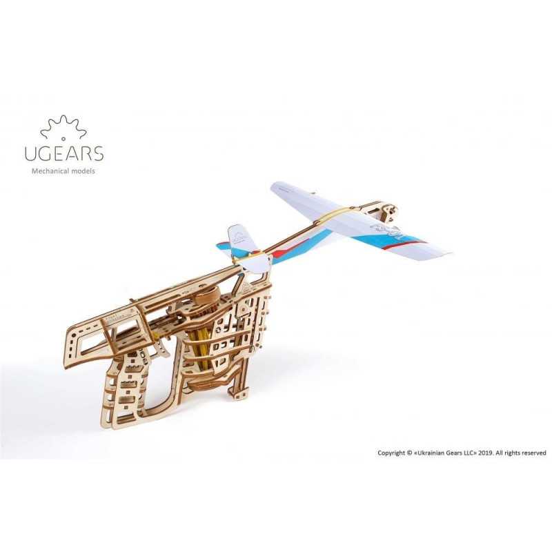 Model jest wyposażony w silnik gumowy, który zapewnia naciąganie. Podczas startu uruchomiony mechanizm z siłą wyrzuca samolot, wysyłając go w lot. Spust katapulty zabezpieczony jest bezpiecznikiem, znajdującym się na uchwycie modelu. Naciągnięcie zależy od stopnia nakręcenia, długość lotu może sięgać 30 metrów. Im silniej nakręcisz uchwyt startowy Twojego modelu balistycznego, tym dalej poleci samolot lub szybowiec. Specjalna nóżka zamienia uchwyt-wyrzutnię w stand dla szybowca lub samolotu. Wyślij samolot w lot z Wyrzutnią Samolotów UGEARS. Życzymy lotnej pogody i dobrego wiatru!