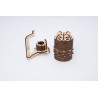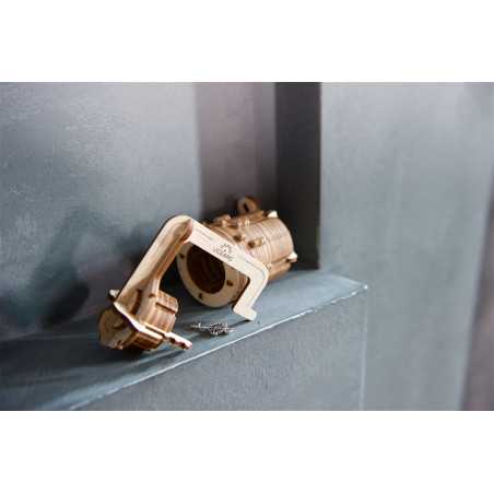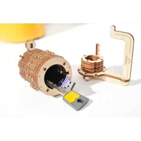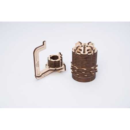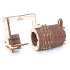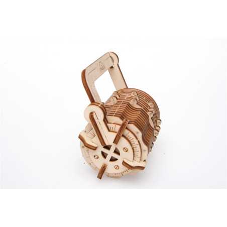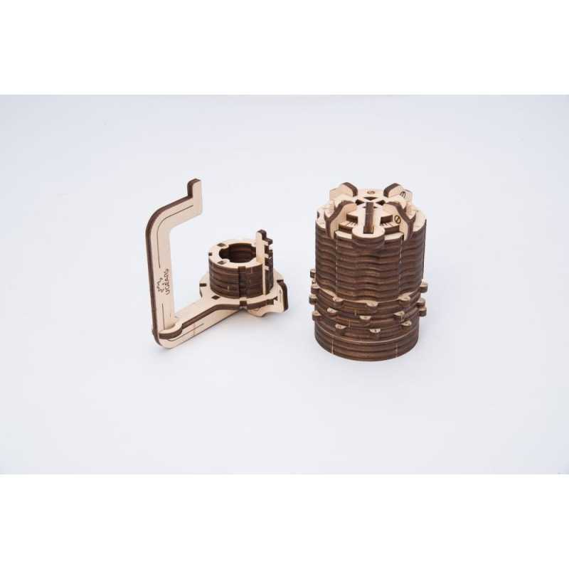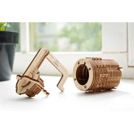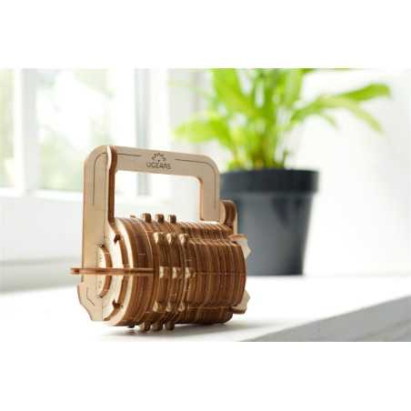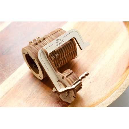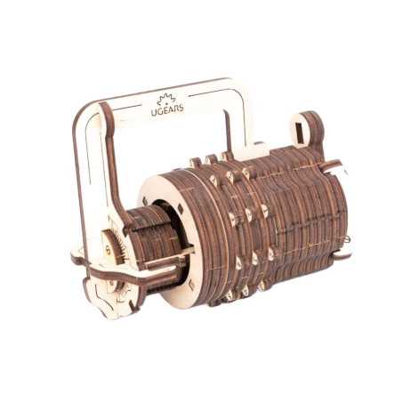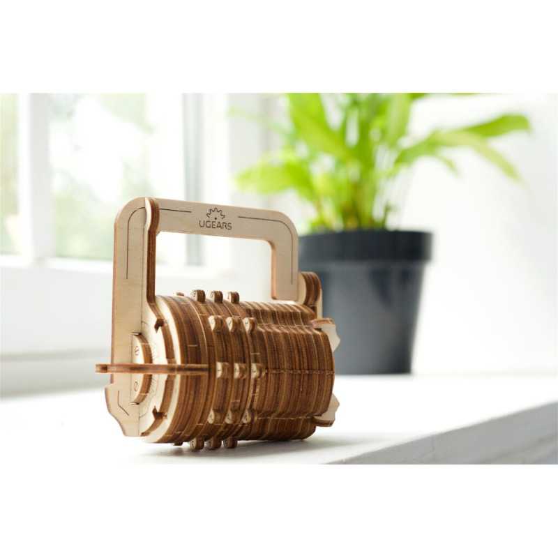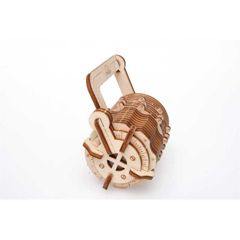 Otwarcie zamka i zajrzenie do środkowego schowka możliwe jest tylko po ustawieniu właściwego kodu. Możesz ukryć w środku klucze, cenne drobiazgi lub cokolwiek chcesz… Zamek posiada “ucho”, przydatne do zawieszenia jego na torbie lub kieszeni Po złożeniu modelu zrozumiesz podstawy działania współczesnych zamków szyfrowych. Zamek posiada możliwość ustalenia 1000 różnych kombinacji (od 0 do 999) szyfru Wówczas, jak i wszystkie modele UGEARS składa się on bez użycia kleju i specjalistycznych narzędzi