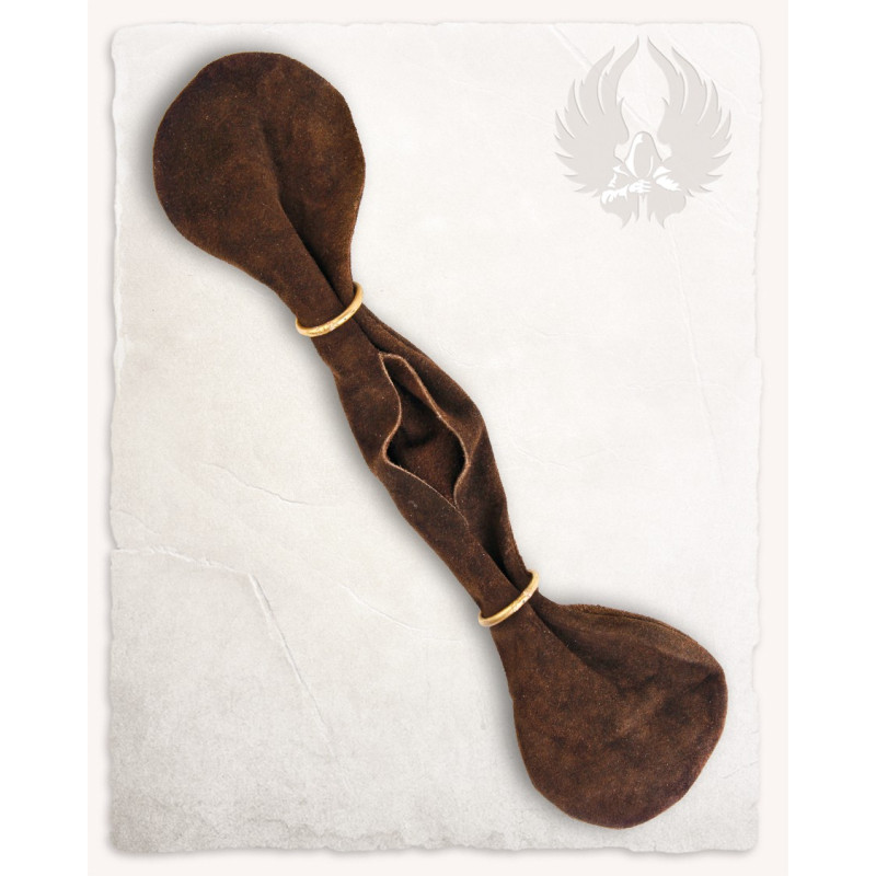 Nasza „Denarius” Geldkatze wykonana jest z miękkiego zamszu i zamykana przy pomocy dwóch masywnych mosiężnych pierścieni.