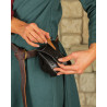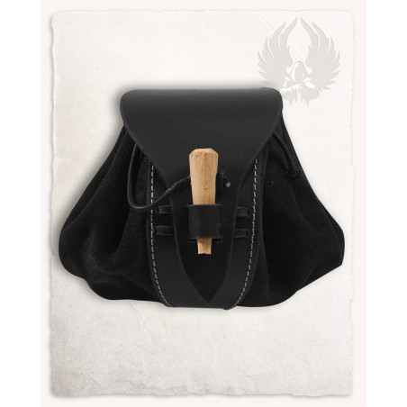 Zamszowa sakiewka zamykana jest na troczek oraz zabezpieczona klapą i drewnianym klinem.
