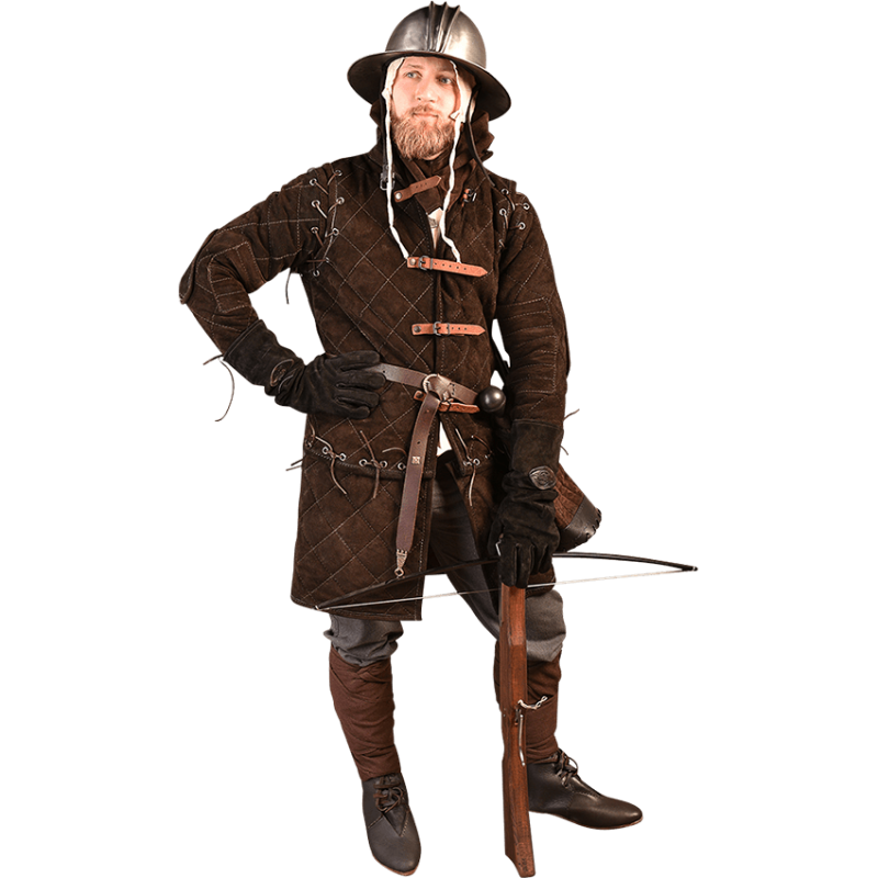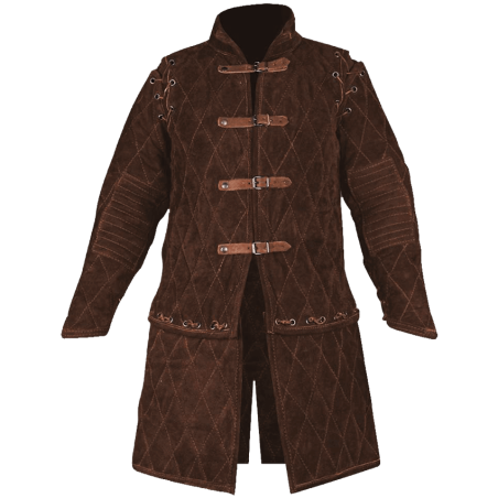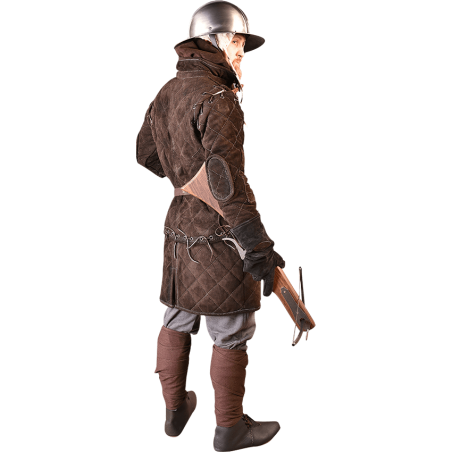 Długa przeszywanica "Arthur" to kamizelka z pikowaniem w kształcie rombów, która doskonale łączy ochronę z wolnością ruchów. Z przodu zapinana jest na cztery sprzączki, a pasujące rękawy oraz naciągi (tassetsy) można przymocować za pomocą mosiężnych oczek. Pikowanie w romby zapewnia doskonałe wypełnienie, nie ograniczając jednak mobilności. Starannie pikowany kołnierz zapewnia dodatkowy komfort w okolicy szyi. Do zestawu dołączone są: kamizelka, tassetsy i dwa pasujące rękawy.