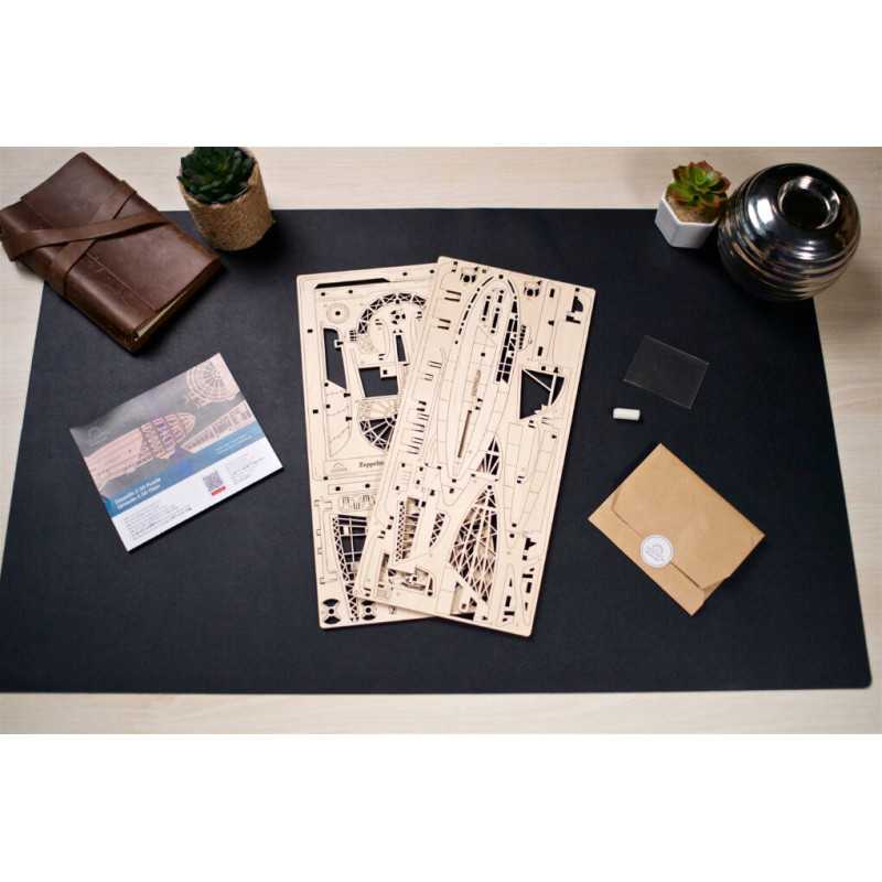 Zainspirowany niemieckimi sterowcami z początku XX wieku i nazwany na cześć niemieckiego wynalazcy hrabiego Ferdinanda von Zeppelina, ten drewniany model sterowca DIY 2.5D ma ruchome elementy i jest dostarczany we własnej ramie, odpowiedniej do powieszenia na ścianie lub postawienia na biurku lub półce. To coś pomiędzy płaskim obrazkiem 2D a modelem 3D. Model obrazkowy UGEARS Zeppelin 2,5D prezentuje 3 perspektywy (widok z boku, powiększony widok kabiny, widok z przodu) i ma kilka ruchomych części, w tym śmigła, ster i stabilizatory, aby ożywić Twoją układankę!