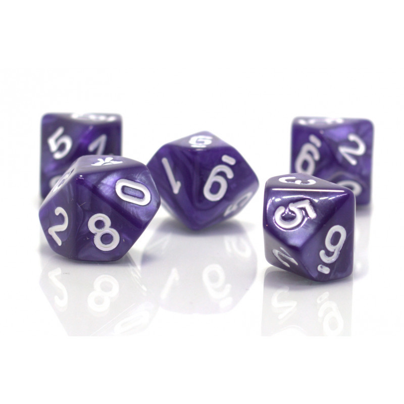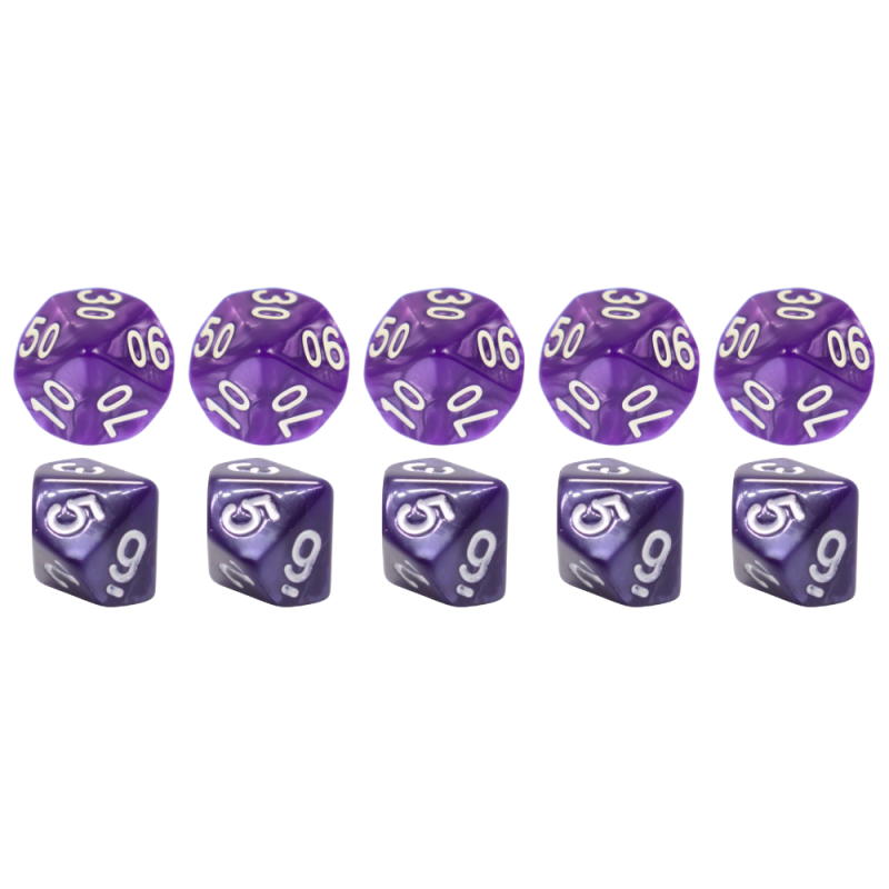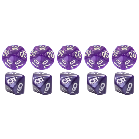 Komplet dziesięciu kości dziesięciościennych numerowanych 0-9 i 00-90. Niezwykle wysoka jakość odlewu, precyzja żłobienia oraz malowania numerów czynią z nich podstawowy wybór dla wielu graczy, zarówno początkujących, jak i zaawansowanych.