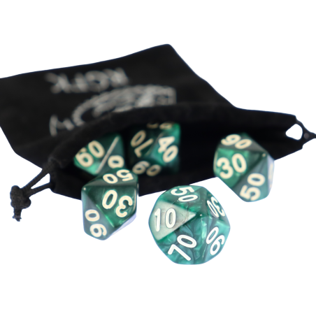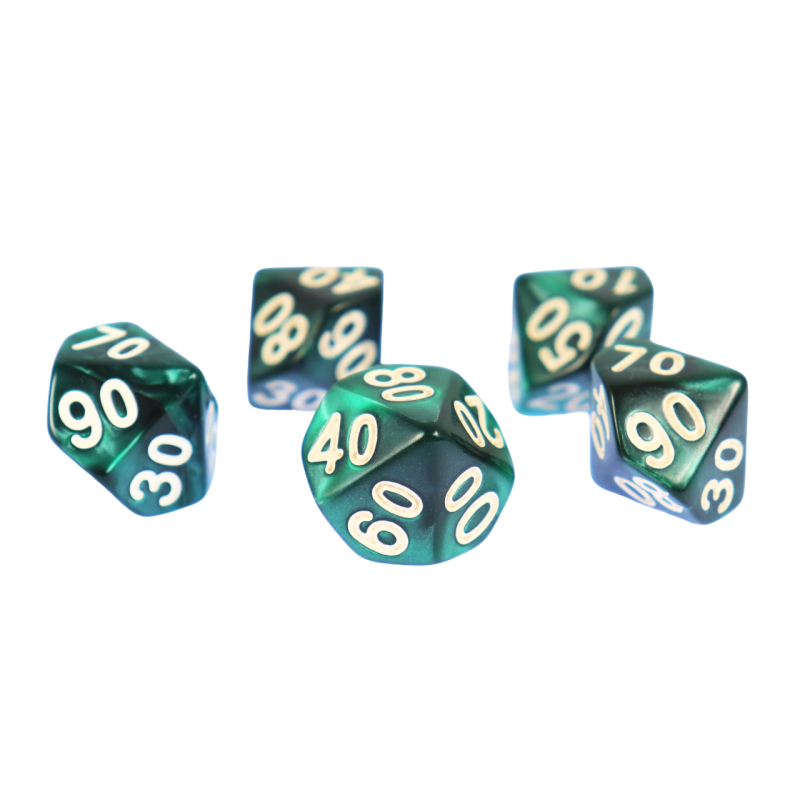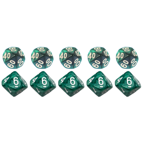 Komplet dziesięciu kości dziesięciościennych numerowanych 0-9 i 00-90. Niezwykle wysoka jakość odlewu, precyzja żłobienia oraz malowania numerów czynią z nich podstawowy wybór dla wielu graczy, zarówno początkujących, jak i zaawansowanych.