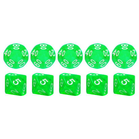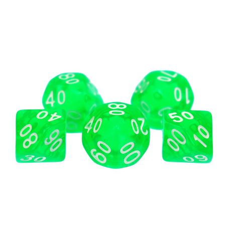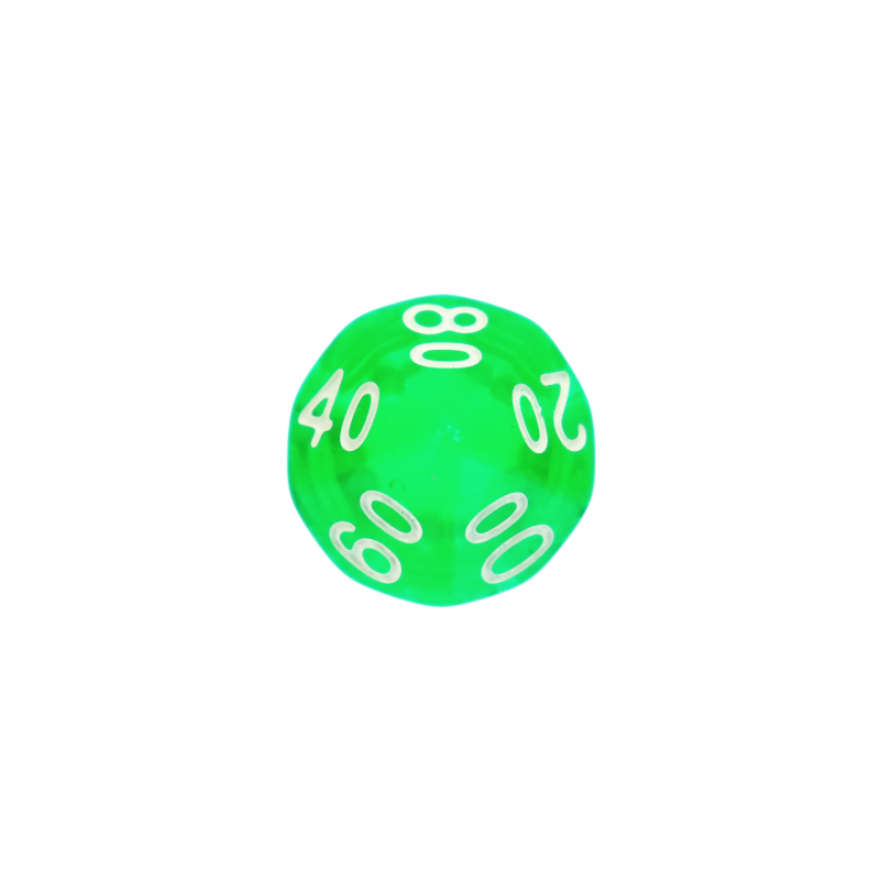 Komplet dziesięciu kości dziesięciościennych numerowanych 0-9 i 00-90. Niezwykle wysoka jakość odlewu, precyzja żłobienia oraz malowania numerów czynią z nich podstawowy wybór dla wielu graczy, zarówno początkujących, jak i zaawansowanych.