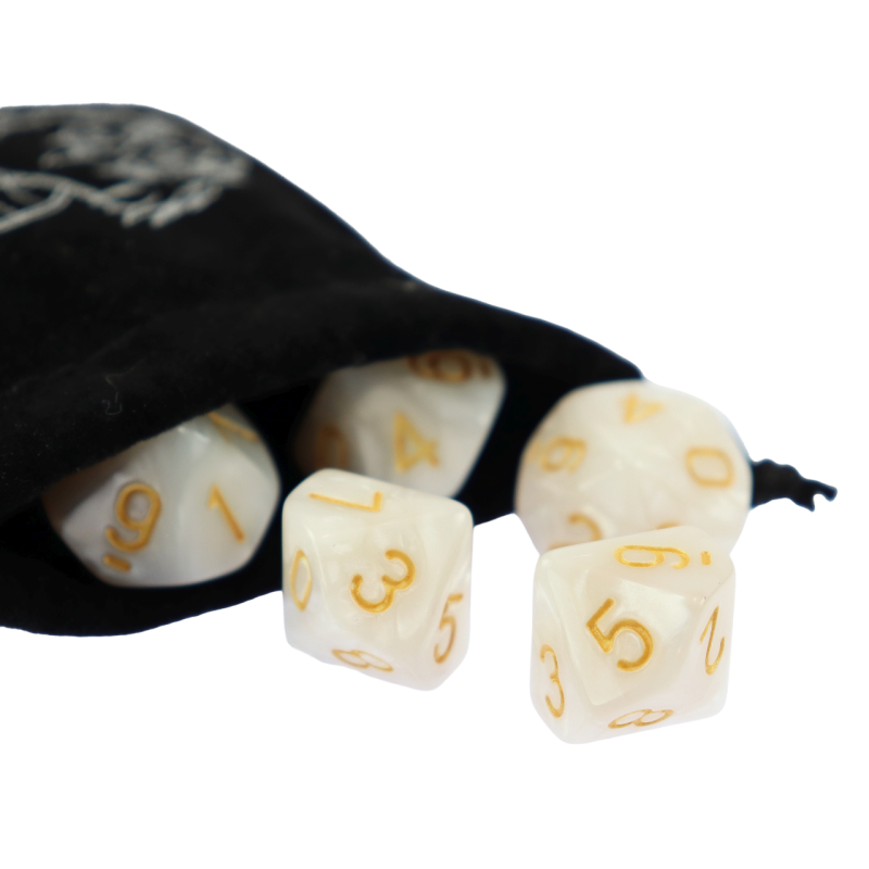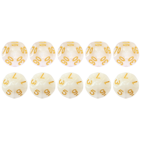 Komplet dziesięciu kości dziesięciościennych numerowanych 0-9 i 00-90. Niezwykle wysoka jakość odlewu, precyzja żłobienia oraz malowania numerów czynią z nich podstawowy wybór dla wielu graczy, zarówno początkujących, jak i zaawansowanych.
