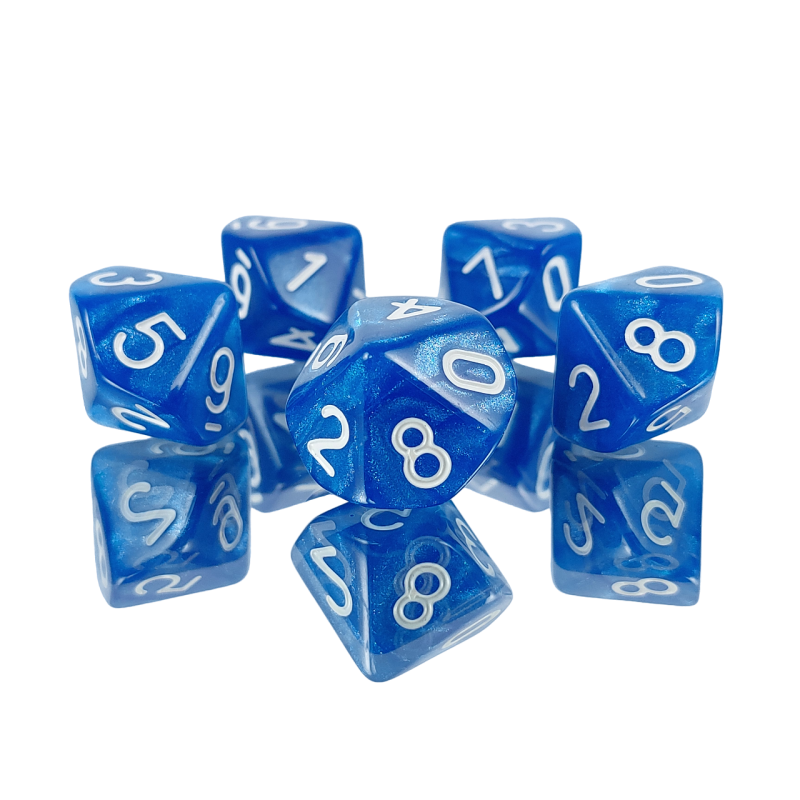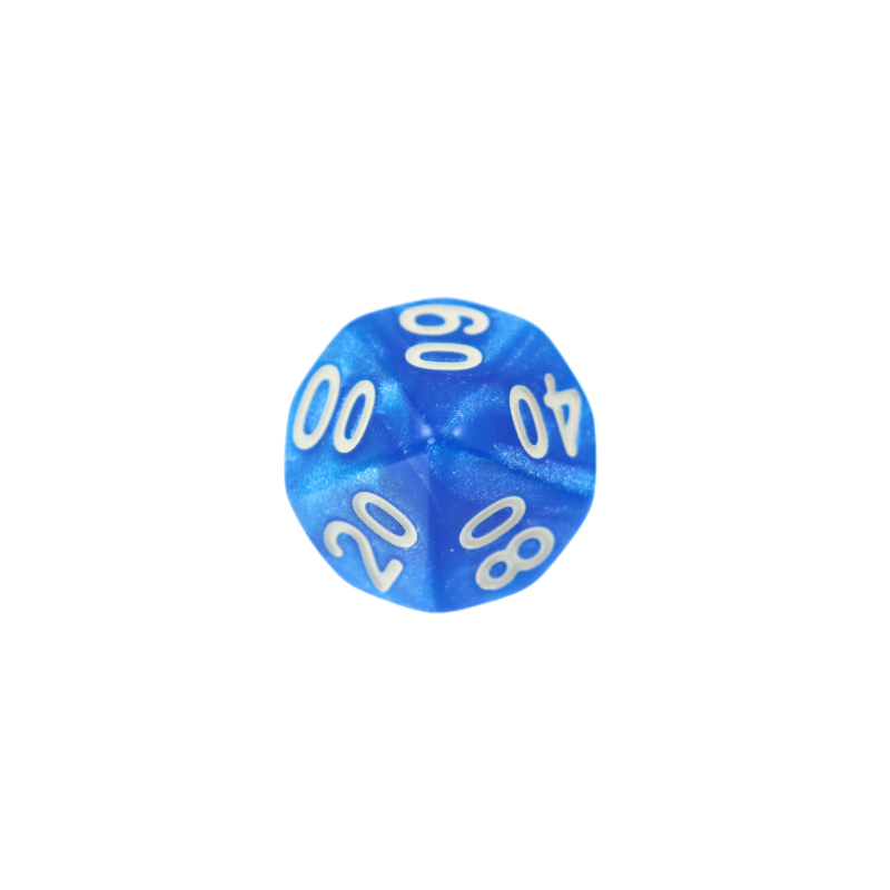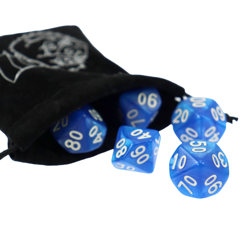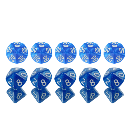 Komplet dziesięciu kości dziesięciościennych numerowanych 0-9 i 00-90. Niezwykle wysoka jakość odlewu, precyzja żłobienia oraz malowania numerów czynią z nich podstawowy wybór dla wielu graczy, zarówno początkujących, jak i zaawansowanych.