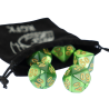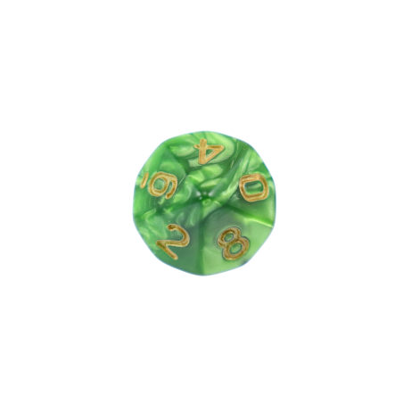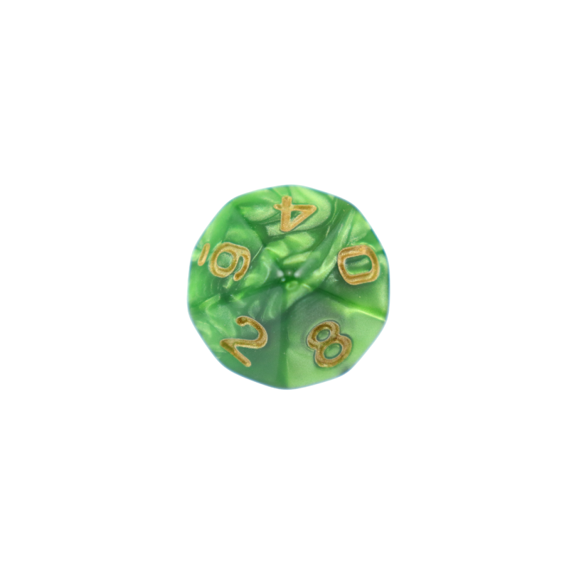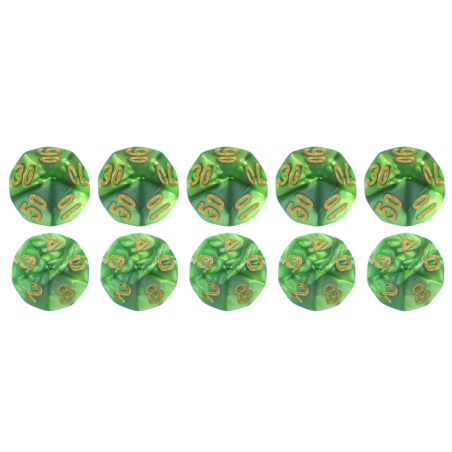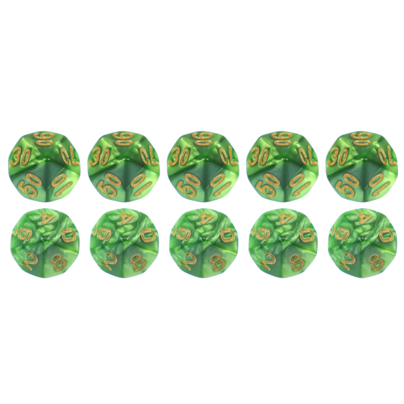 Komplet dziesięciu kości dziesięciościennych numerowanych 0-9 i 00-90. Niezwykle wysoka jakość odlewu, precyzja żłobienia oraz malowania numerów czynią z nich podstawowy wybór dla wielu graczy, zarówno początkujących, jak i zaawansowanych.