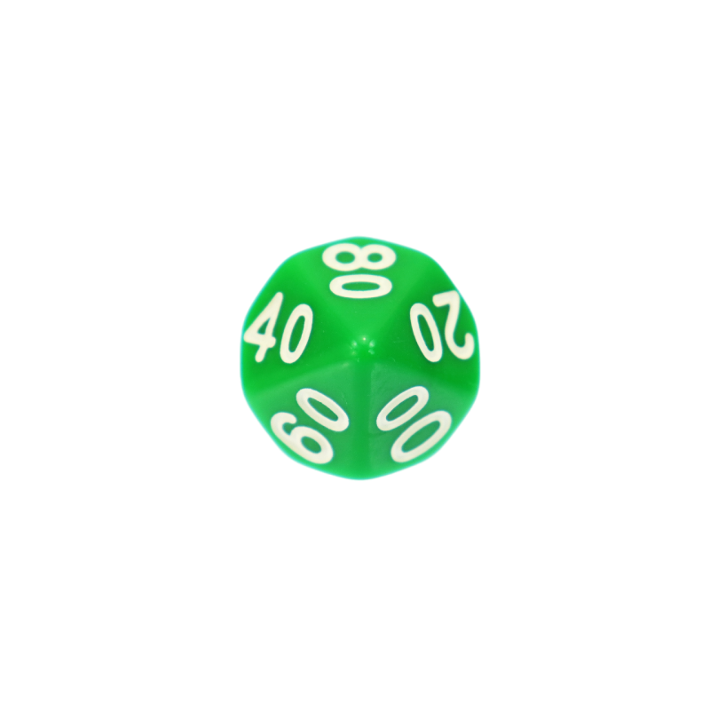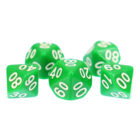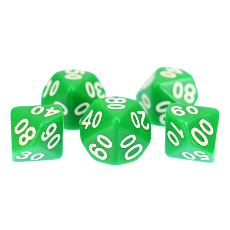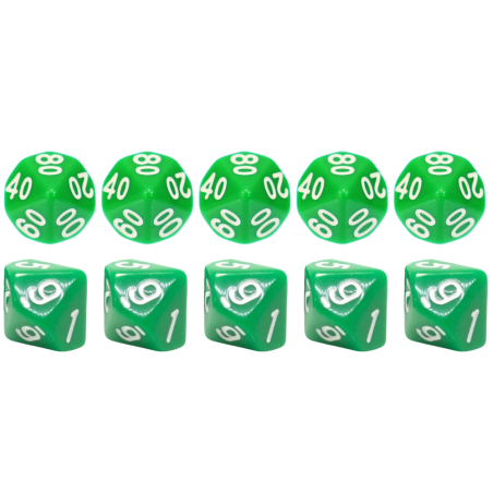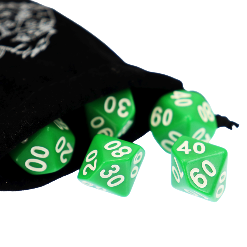 Komplet dziesięciu kości dziesięciościennych numerowanych 0-9 i 00-90. Niezwykle wysoka jakość odlewu, precyzja żłobienia oraz malowania numerów czynią z nich podstawowy wybór dla wielu graczy, zarówno początkujących, jak i zaawansowanych.
