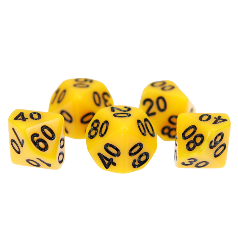 Komplet dziesięciu kości dziesięciościennych numerowanych 0-9 i 00-90. Niezwykle wysoka jakość odlewu, precyzja żłobienia oraz malowania numerów czynią z nich podstawowy wybór dla wielu graczy, zarówno początkujących, jak i zaawansowanych.