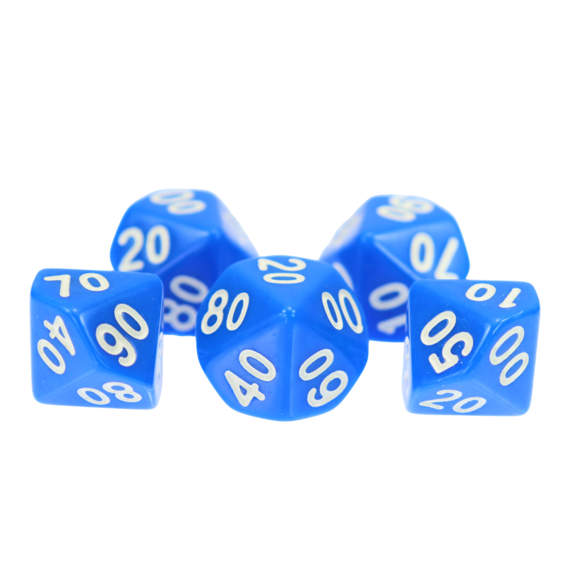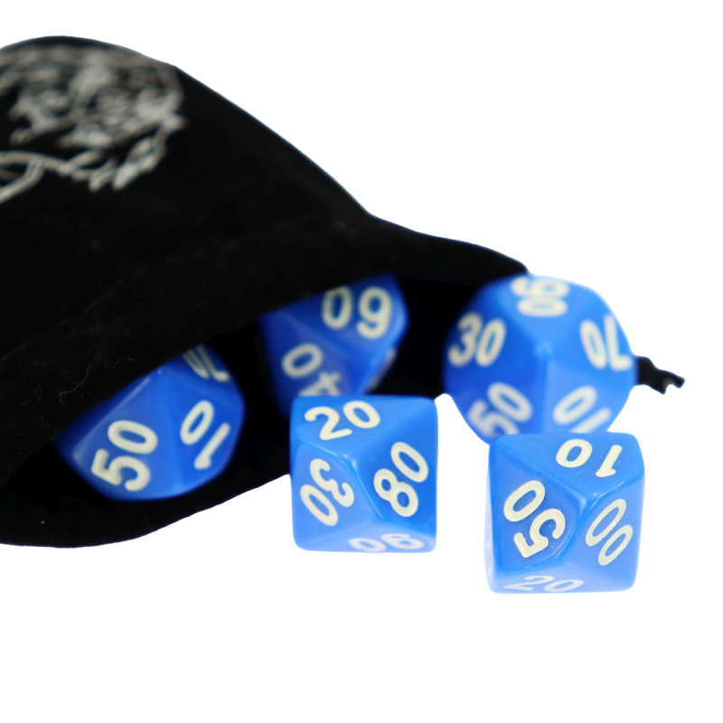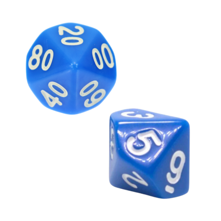 Komplet dwóch kości dziesięciościennych numerowanych 0-9 i 00-90. Niezwykle wysoka jakość odlewu, precyzja żłobienia oraz malowania numerów czynią z nich podstawowy wybór dla wielu graczy, zarówno początkujących, jak i zaawansowanych.