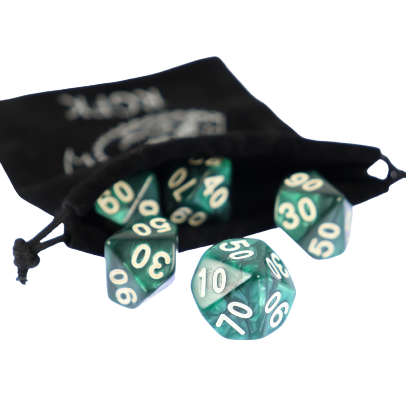 Komplet dwóch kości dziesięciościennych numerowanych 0-9 i 00-90. Niezwykle wysoka jakość odlewu, precyzja żłobienia oraz malowania numerów czynią z nich podstawowy wybór dla wielu graczy, zarówno początkujących, jak i zaawansowanych.