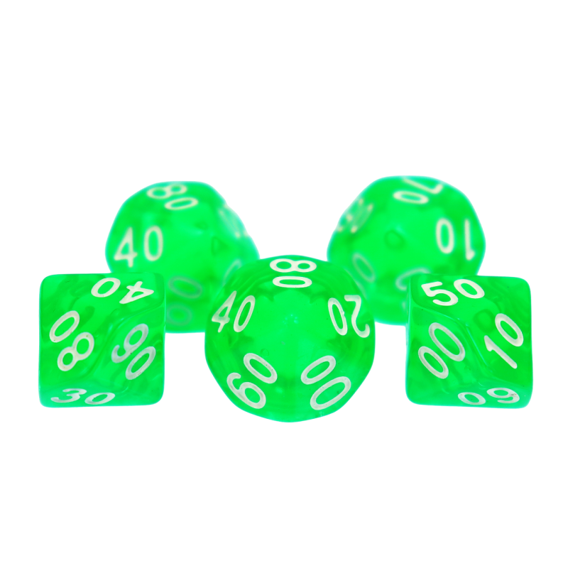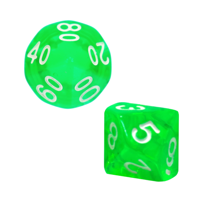 Komplet dwóch kości dziesięciościennych numerowanych 0-9 i 00-90. Niezwykle wysoka jakość odlewu, precyzja żłobienia oraz malowania numerów czynią z nich podstawowy wybór dla wielu graczy, zarówno początkujących, jak i zaawansowanych.