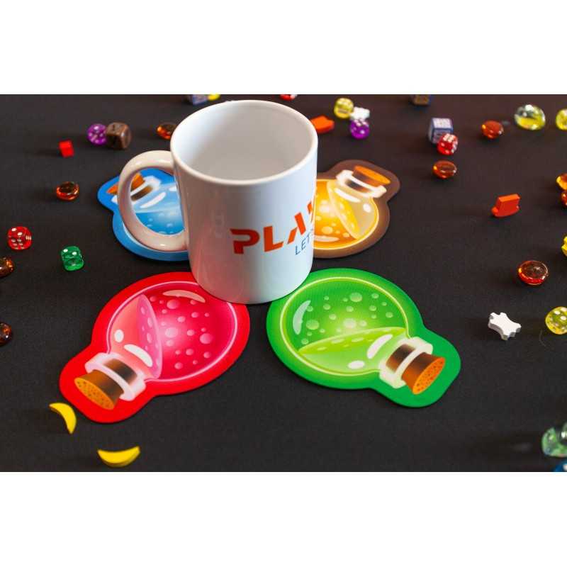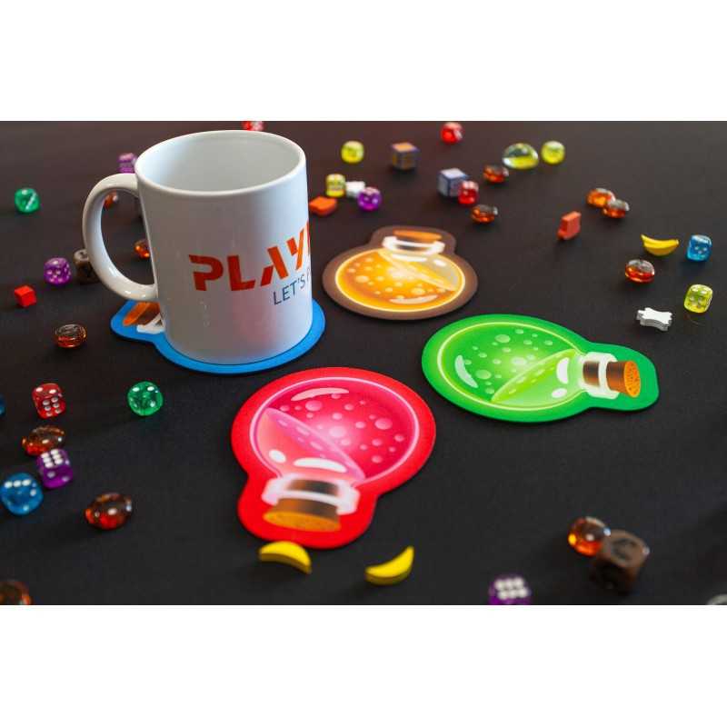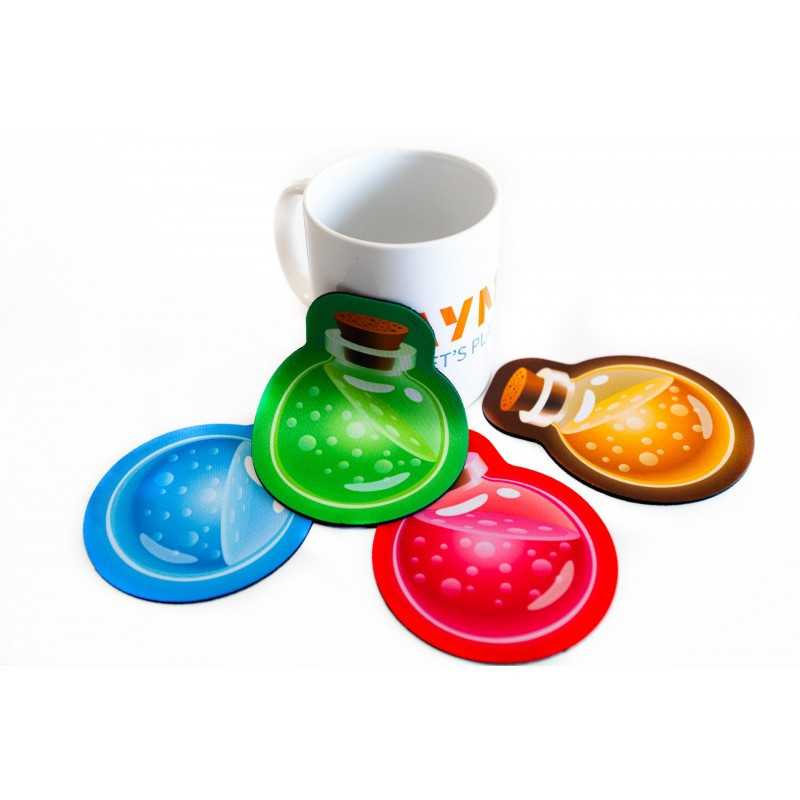 Wysokiej jakości gumowe, antypoślizgowe podkładki pod kubek z motywem mikstur z gier planszowych. Podkładki są miękkie i elastyczne, można je łatwo przechowywać lub przenosić nawet w kieszeni, a w przypadku zabrudzenia lub zalania napojem bardzo prosto je wysuszyć, wyczyścić lub nawet wyprać w pralce. Zestaw podkładek to idealny prezent dla każdego miłośnika gier.