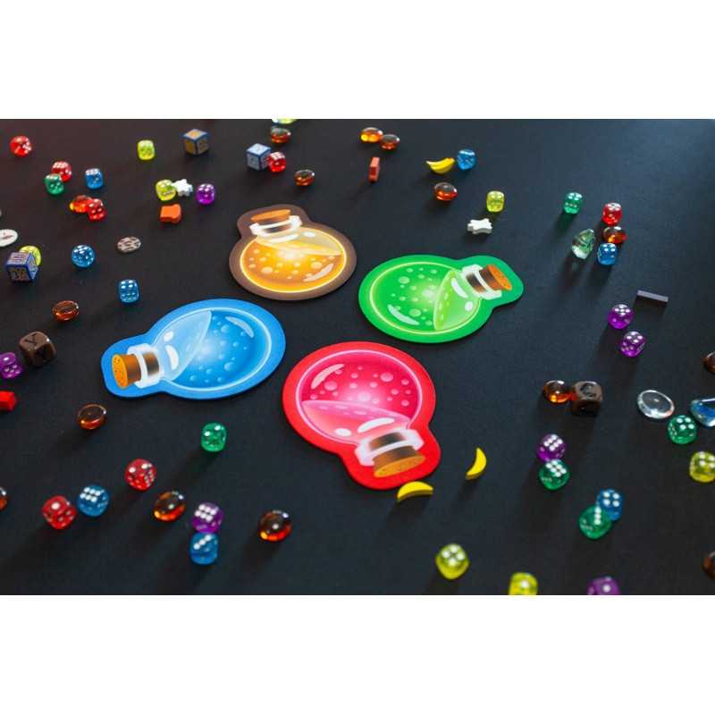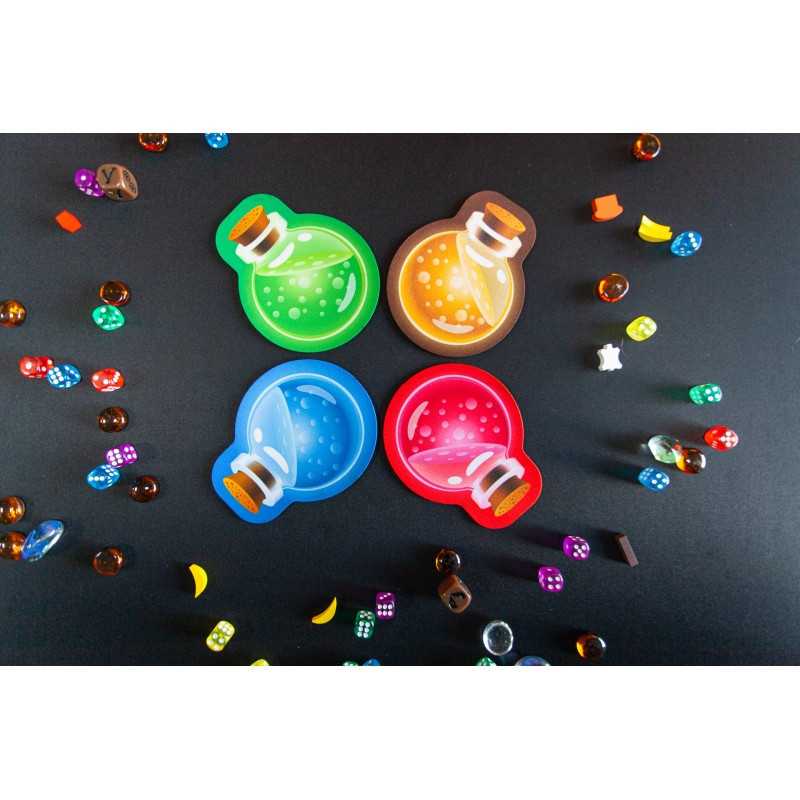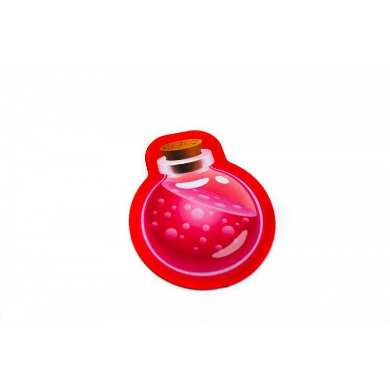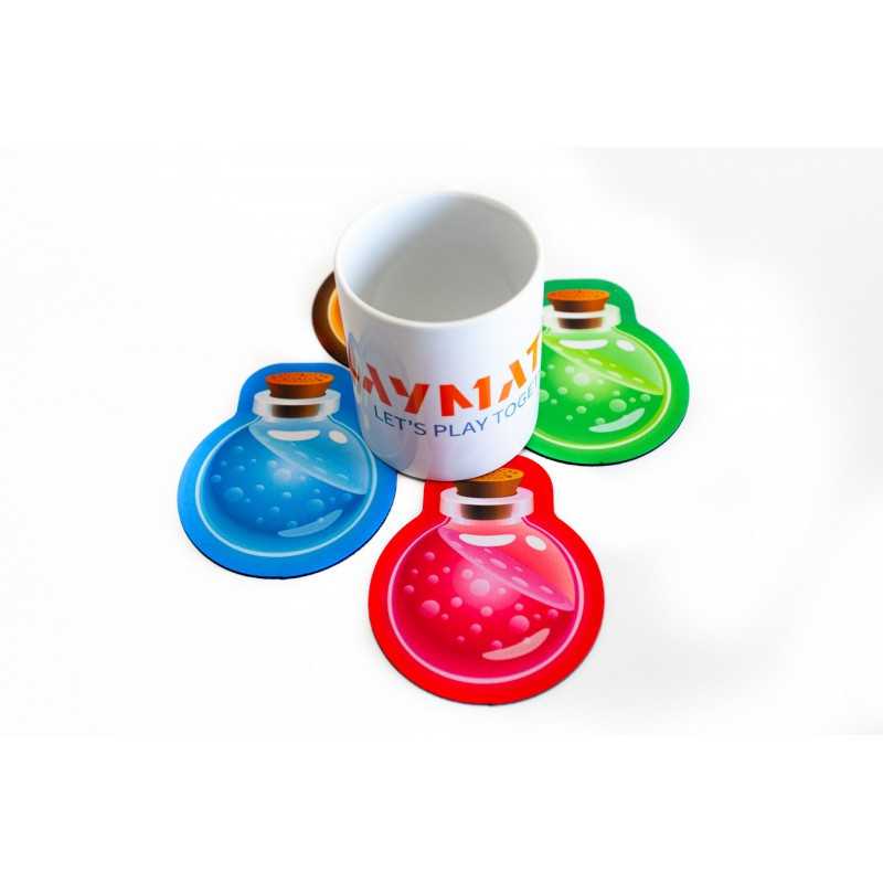 Ilustracje przedstawiają bardzo popularne w grach planszowych i komputerowych mikstury - eliksir życia, many, siły oraz staminy. Szacowany rozmiar podkładek to 10 cm x 10 cm. W komplecie znajdują się 4 sztuki podkładek o różnych wzorach.